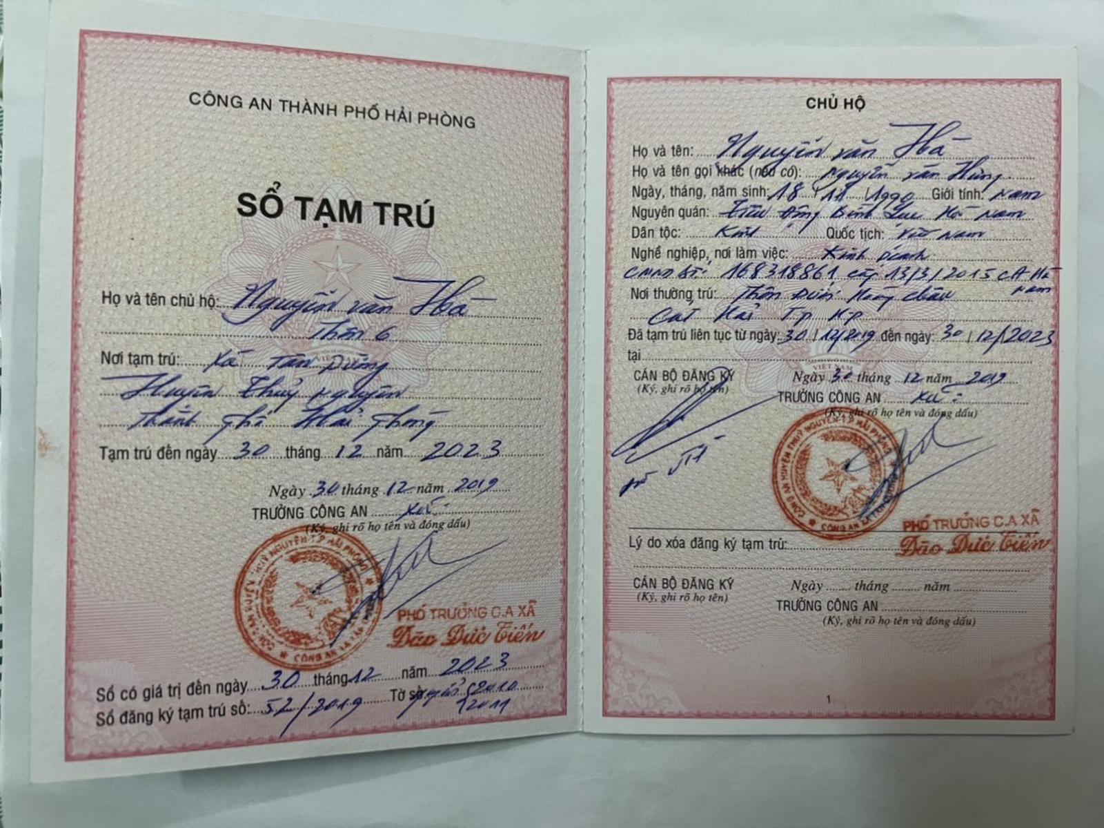 Gia đình bà Hằng được UBND huyện Thủy Nguyên cấp giấy chứng nhận quyền sử dụng đất, xây nhà để ở tại thôn 6 Tân Dương từ năm 2019. Bản thân con trai bà Hằng (anh Nguyễn Văn Hà) cũng ý thức về việc tuân thủ pháp luật về cư trú nên ngay khi sinh sống tại Tân Dương đã đăng ký tạm trú vào ngày 30/12/2019 (Sổ đăng ký tạm trú số 52/2019 do ông Đào Đức Tiến, Phó trưởng Công an xã Tân Dương ký, có giá trị đến ngày 30/12/2023).