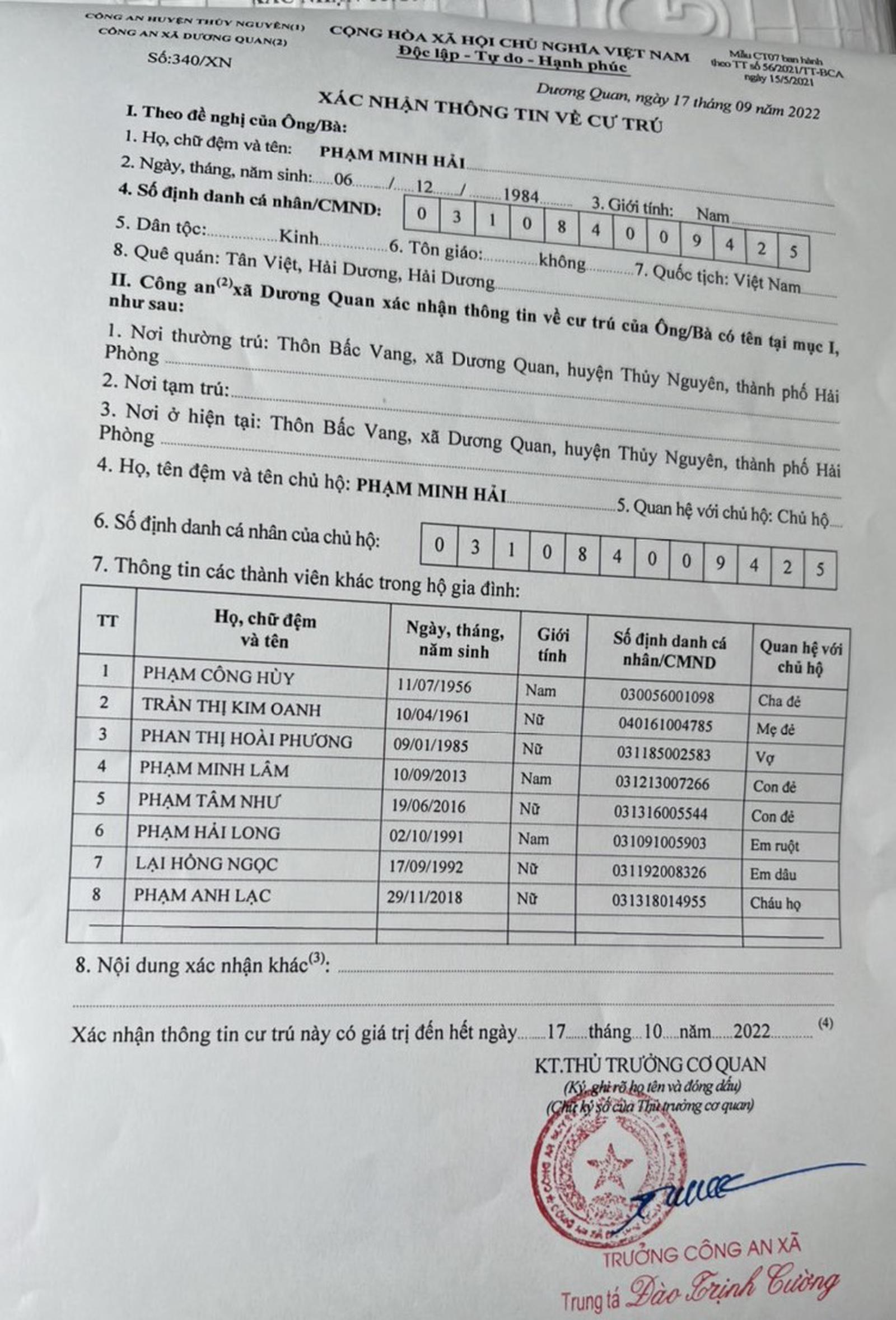 Giấy tờ xác nhận thông tin về cư trú của hộ ông Phạm Minh Hải. Ảnh: PV