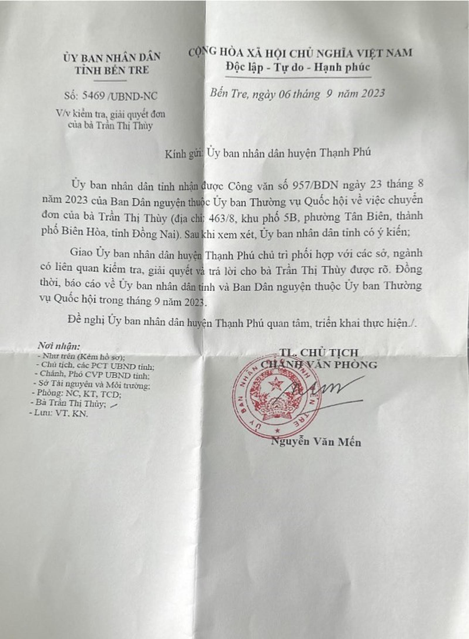 Sau khi nhận được Công văn 957/BDN của Ban Dân nguyện thuộc Ủy ban Thường vụ Quốc hội, ngày 6/9/2023, UBND tỉnh Bến Tre cũng có Công văn số 5469/UBND-NC gửi UBND huyện Thạnh Phú, nội dung nêu: “Giao UBND huyện Thạnh Phú chủ trì phối hợp với các sở, ngành có liên quan kiểm tra, giải quyết vụ việc. Đồng thời báo cáo về UBND tỉnh và Ban Dân nguyện thuộc Ủy ban Thường vụ Quốc hội. Đề nghị UBND huyện Thạnh Phú triển khai thực hiện”.