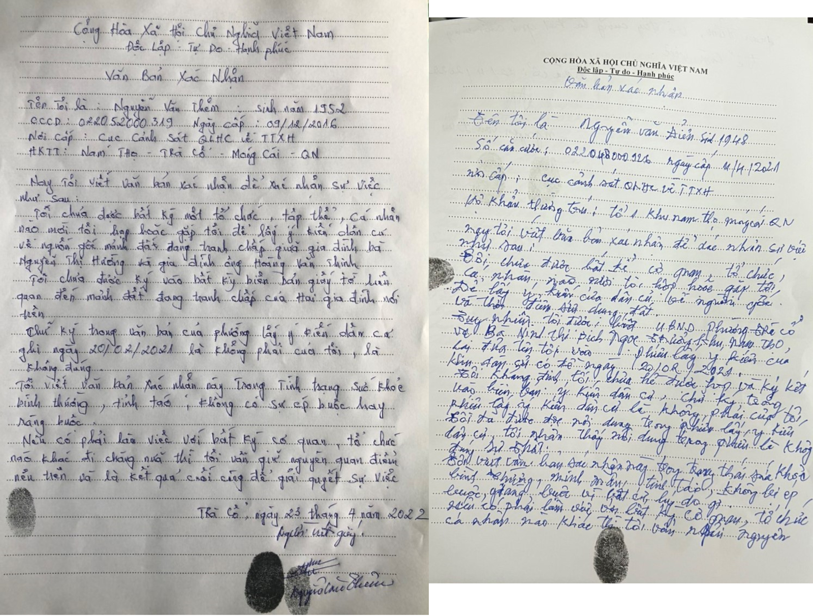 Trái ngược với nội dung được xác nhận trong phiếu lấy ý kiến, hai người này khẳng định chưa bao giờ được bất kỳ tổ chức, tập thể, cá nhân nào mời họp hoặc gặp để lấy ý kiến dân cư về nguồn gốc mảnh đất đang tranh chấp giữa gia đình bà Hường và ông Thịnh và cũng chưa ký vào bất cứ giấy tờ gì liên quan mảnh đất nói trên.