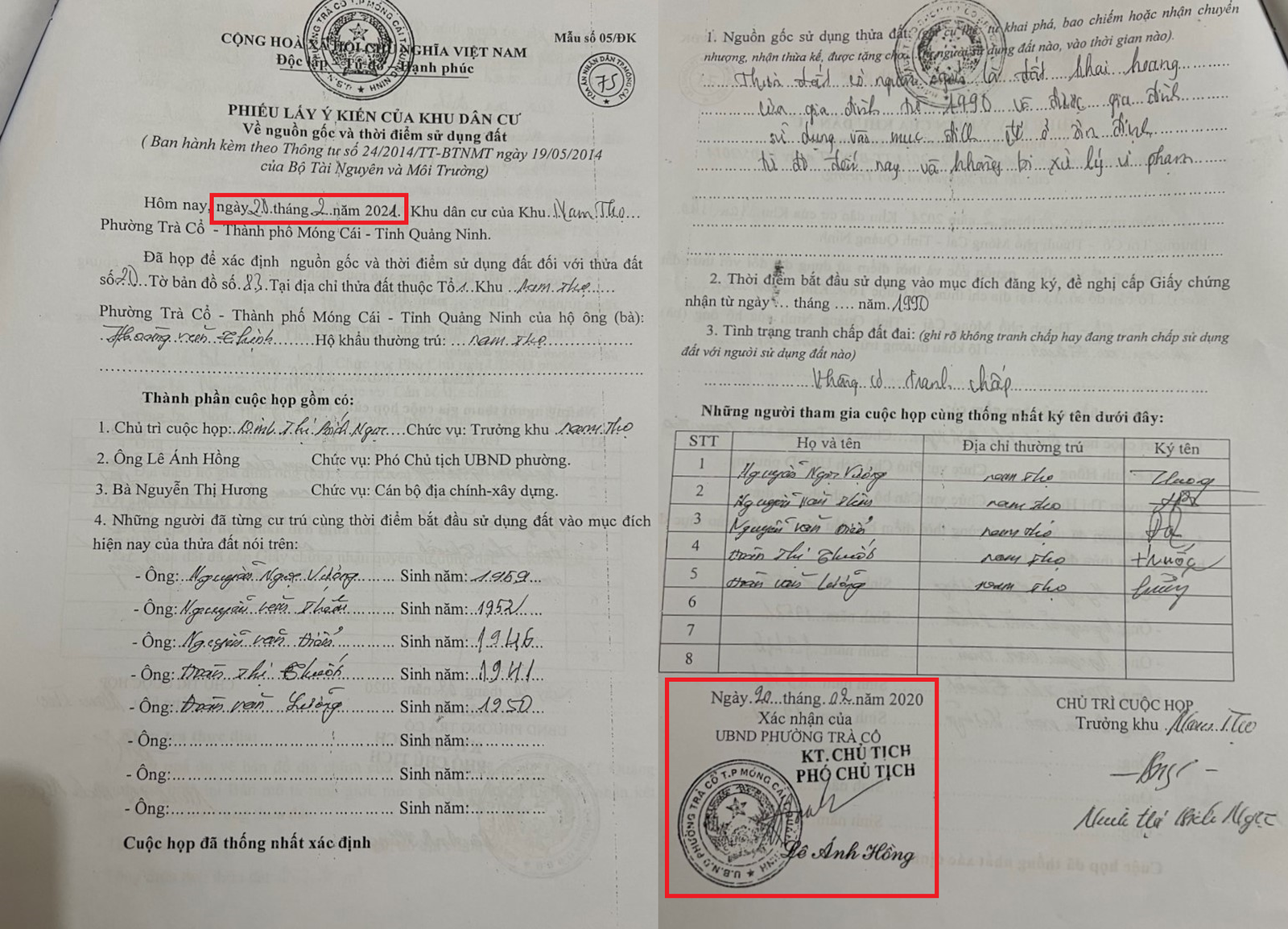 Phiếu lấy ý kiến đề ngày 20/2/2021 tại khu Nam Thọ, phường Trà Cổ. Thành phần họp lấy ý kiến bao gồm: Trưởng khu Nam Thọ, bà Ninh Thị Bích Ngọc; Phó Chủ tịch UBND phường, ông Lê Ánh Hồng; cán bộ địa chính, bà Nguyễn Thị Hương cùng những người từng cư trú cùng thời điểm bắt đầu sử dụng đất vào mục đích hiện nay của thửa đất nói trên gồm: Ông Nguyễn Ngọc Vương, ông Nguyễn Văn Thêm, ông Nguyễn Văn Điển, bà Đoàn Thị Thuốt, ông Đoàn Văn Lưỡng.