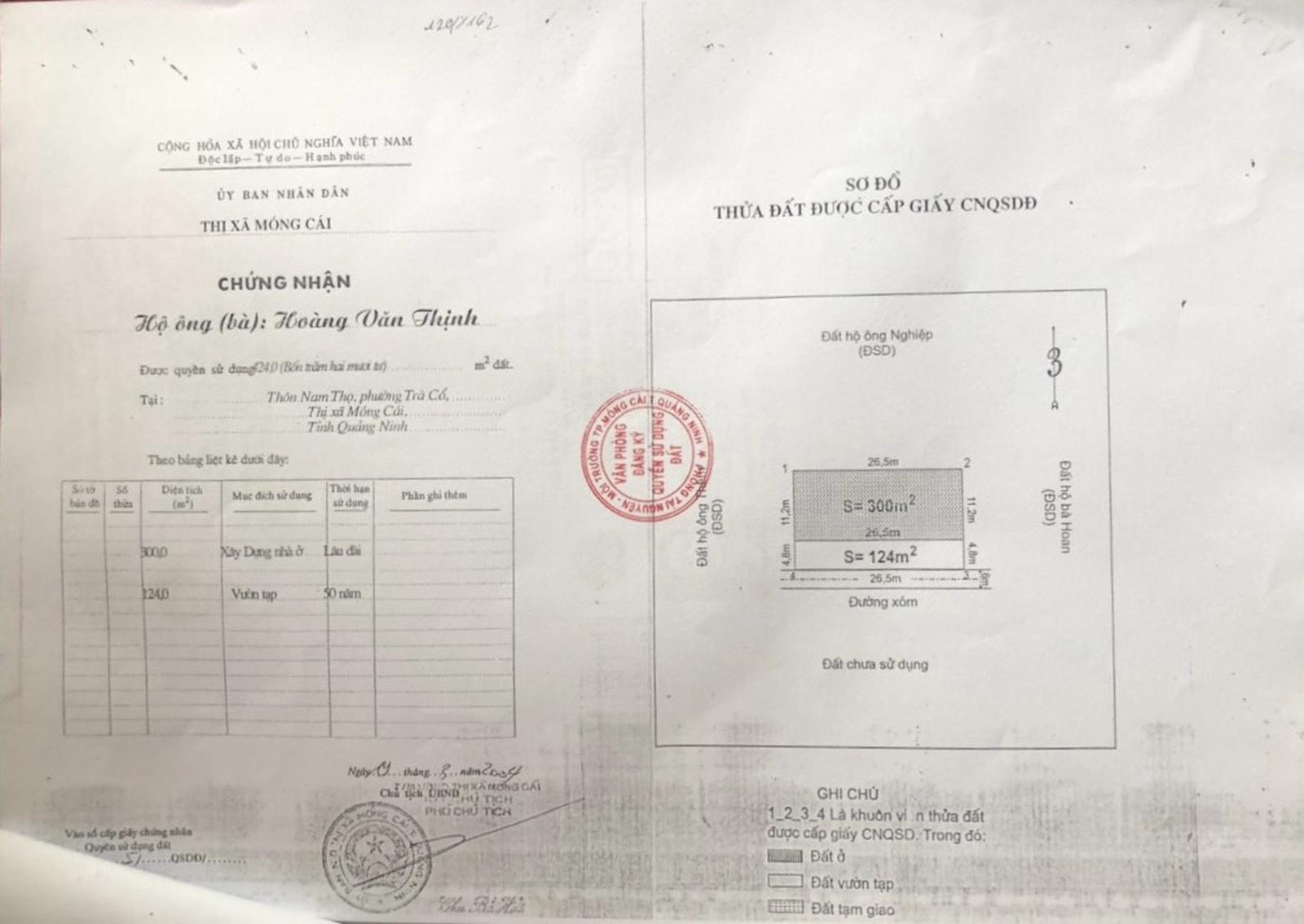 Hồ sơ đề nghị cấp GCNQSDĐ của ông Thịnh được UBND phường Trà Cổ làm thủ tục và trình UBND TP Móng Cái phê duyệt. Tuy nhiên, hiện nay hồ sơ xin cấp GCNQSDĐ của ông Thịnh đang phải tạm dừng vì phát sinh tranh chấp với gia đình bà Hường.