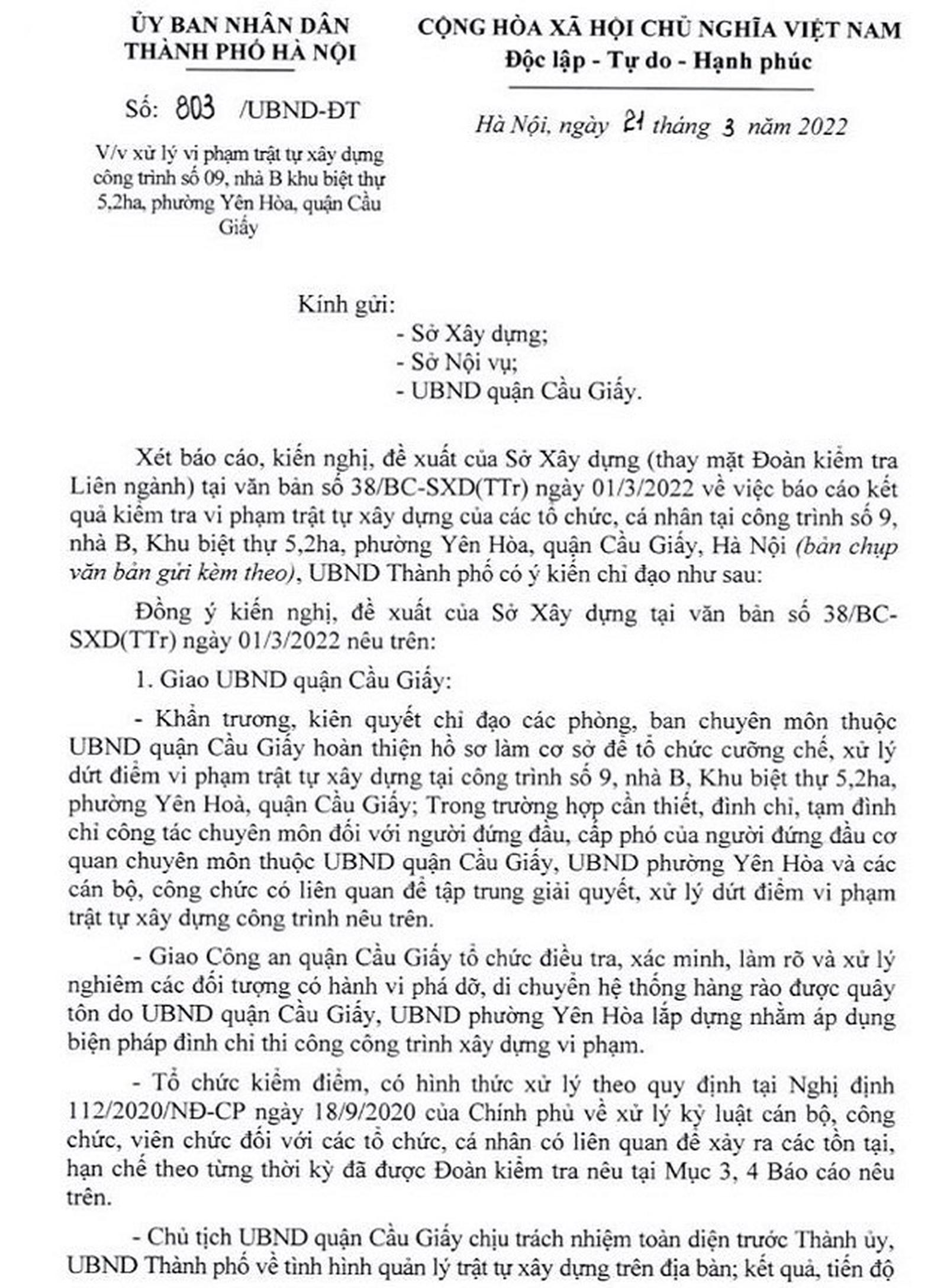 Trước đó, ngày 21/3/2022 UBND thành phố Hà Nội đã có Văn bản số 803 về việc xử lý vi phạm TTXD tại công trình số 9, nhà B, khu biệt thự 5,2ha, phường Yên Hòa gửi Sở Xây dựng, Sở Nội vụ và UBND quận Cầu Giấy.