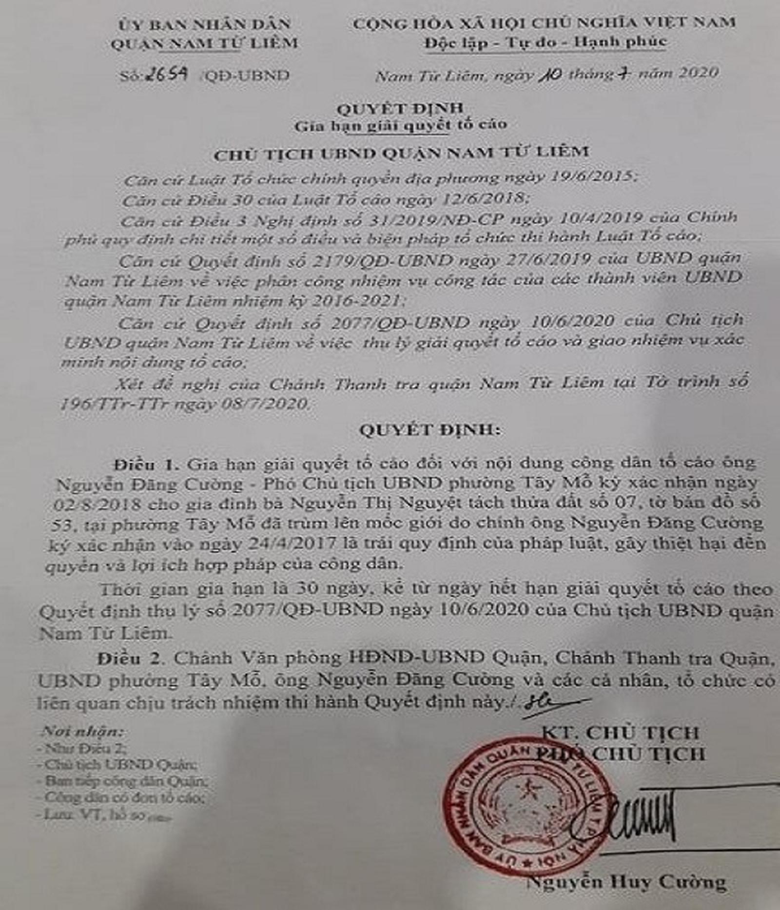 Quyết định gia hạn giải quyết tố cáo đối với ông Nguyễn Đăng Cường, Phó Chủ tịch phường Tây Mỗ. Ảnh: TQ
