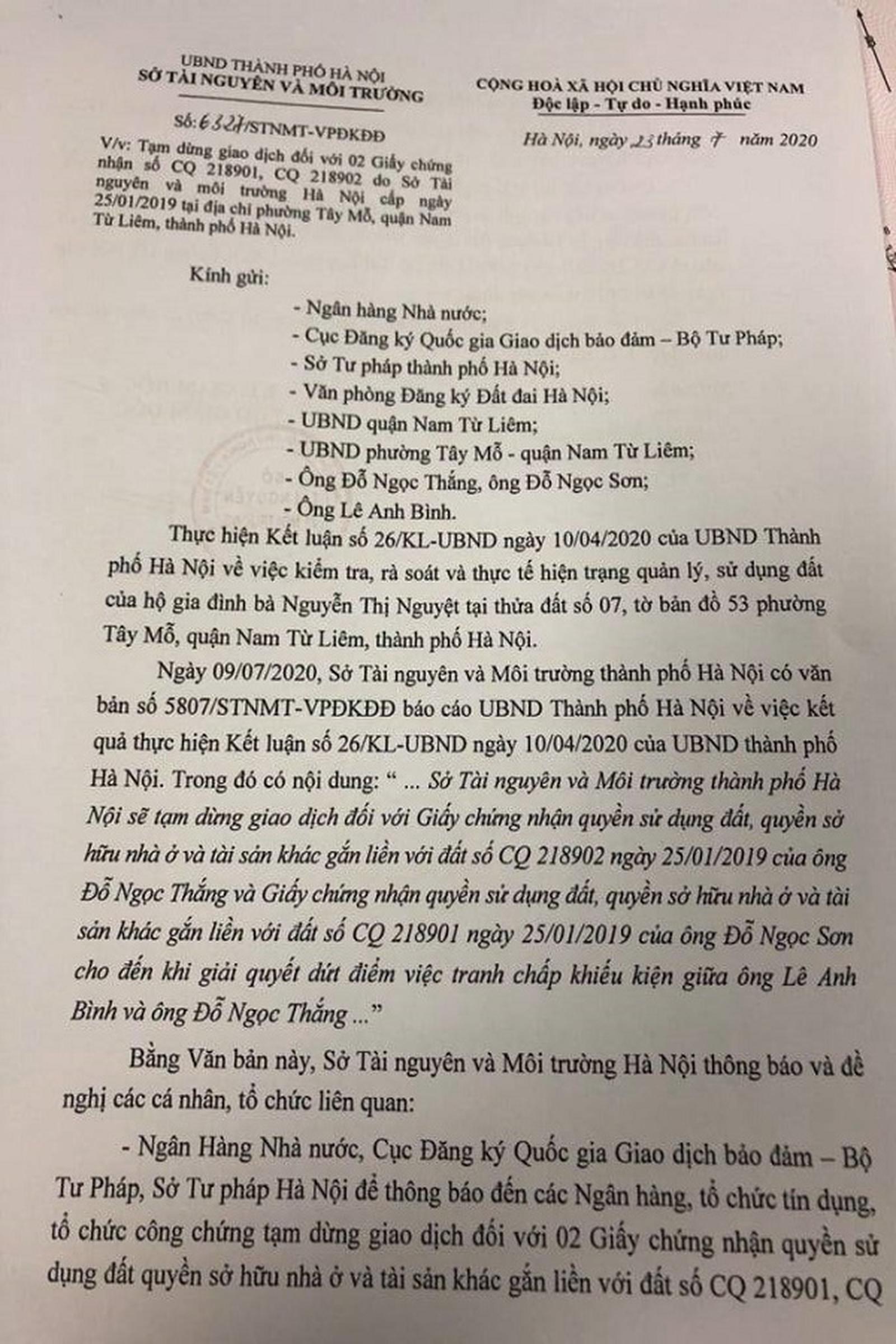 Do bất hợp tác trong việc thực hiện Kết luận số 26/KL-UBND, nên ngày 23/7/2020, Sở TN&MT Hà Nội đã có Văn bản số 6327/STNMT-VPĐKĐĐ về việc tạm dừng giao dịch đối với 02 GCNQSDĐ số CQ 218901 và CQ 218902 (của ông Đỗ Ngọc Thắng và ông Đỗ Ngọc Sơn) do Sở TN&MT Hà Nội cấp ngày 25/01/2019 tại địa chỉ phường Tây Mỗ, quận NTL gửi các cơ quan chức năng để thực hiện.