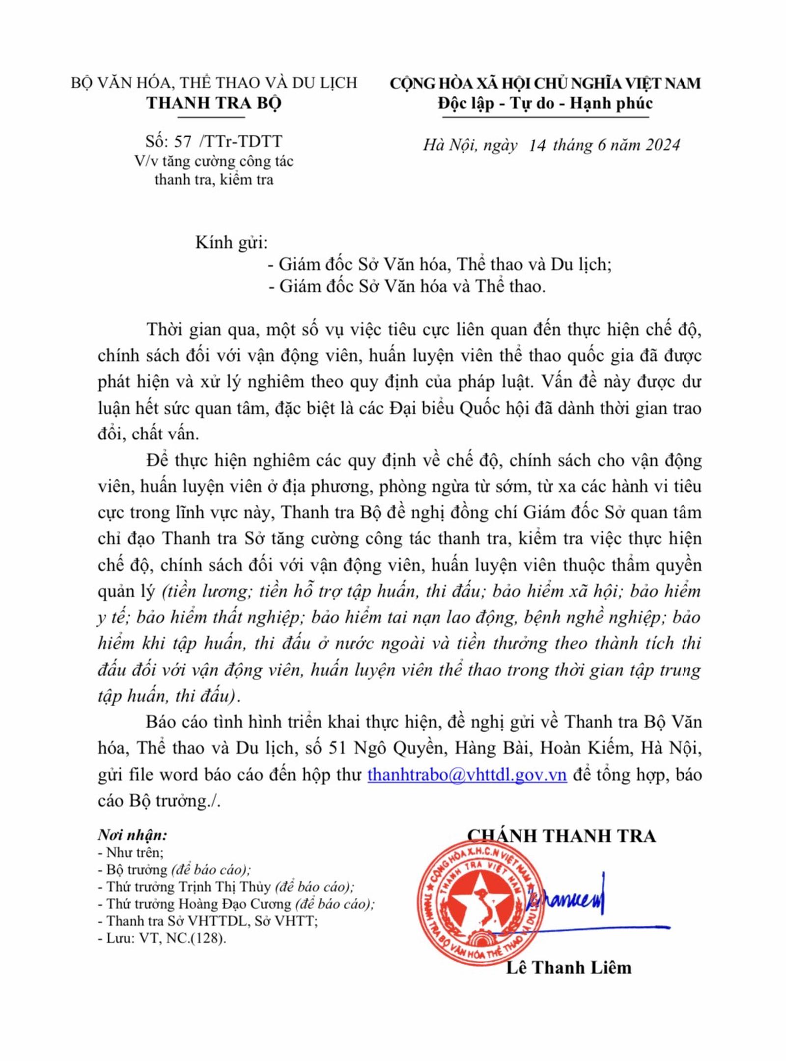 Từ những vụ việc tiêu cực liên quan đến thực hiện chế độ chính sách đối với VĐV, HLV thể thao quốc gia đã phát hiện và xử lý trong thời gian qua, Thanh tra Bộ Văn hóa - Thể thao và Du lịch có Công văn số 57, ngày 14/6/2024 gửi Giám đốc các Sở Văn hóa - Thể thao và Du lịch trên cả nước về việc tăng cường công tác thanh tra, kiểm tra.
