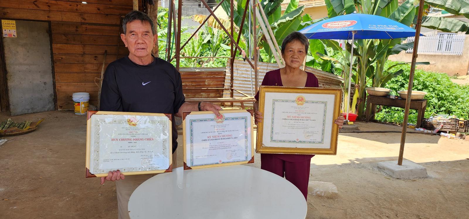 Vợ chồng bà Huỳnh Thị Tĩnh cùng các huy chương, kỷ niệm chương kháng chiến