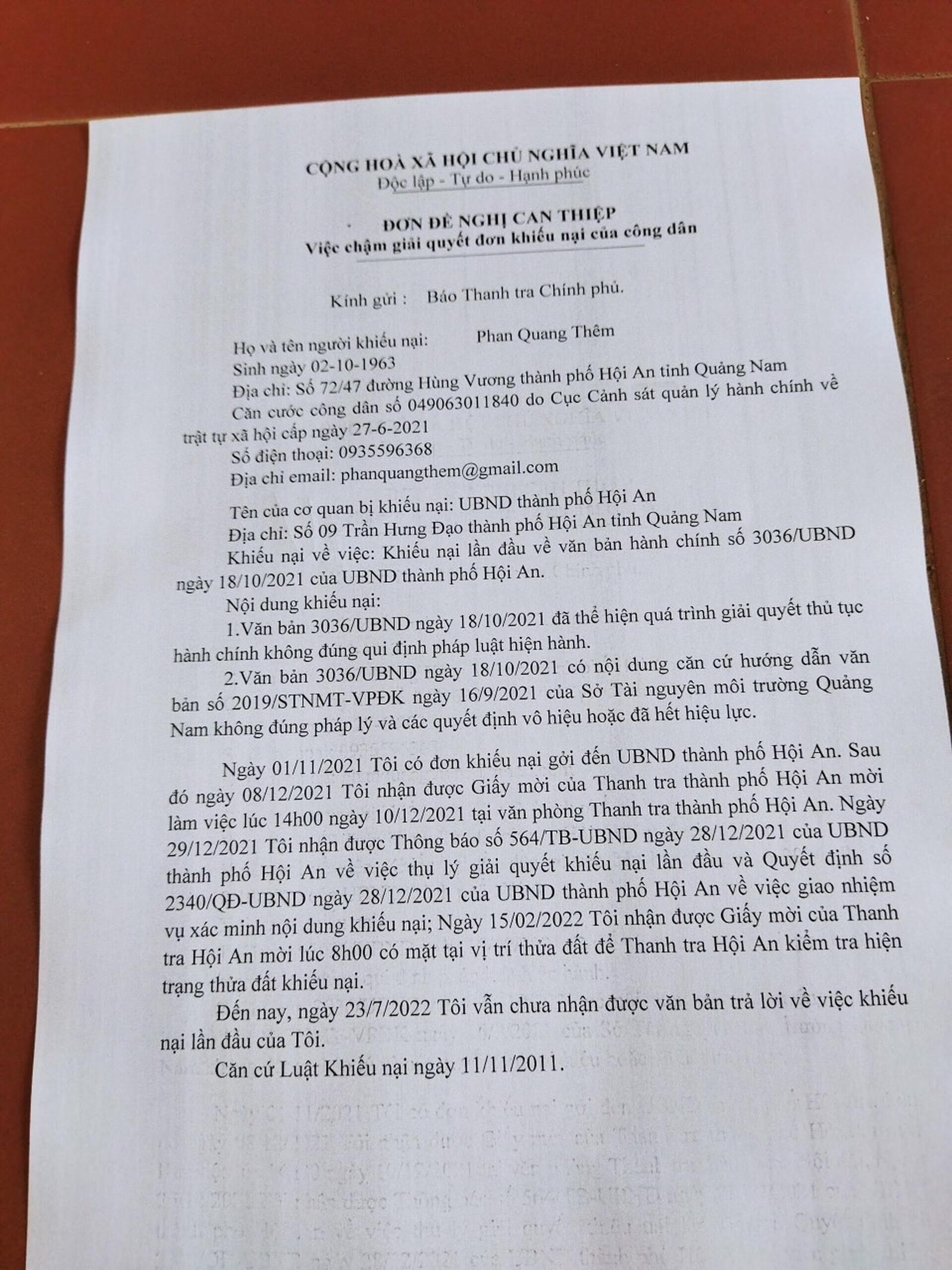 Không đồng ý với nội dung trả lời của UBND TP, ngày 1/11/2021, ông Thêm gửi đơn khiếu nại Công văn số 3036 ngày 18/10/2021 của UBND TP Hội An về việc không cấp sổ đỏ đất đai cho ông đối với 204m2 đất theo hiện trạng sử dụng của gia đình ông; được rào dậu ngăn cách với các thửa đất liền kề từ năm 1996; không có tranh chấp.