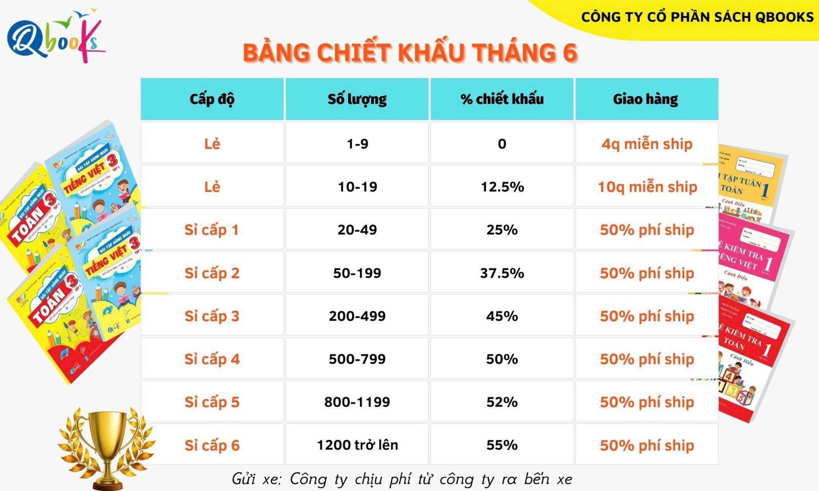 Theo đó, khi nhập đơn hàng từ 10 quyển tại Công ty Qbooks sẽ được chiết khấu 12,5%; đơn hàng từ 20 quyển chiết khấu 20%; đơn hàng 50 quyển sẽ được hưởng ưu đãi 37,5%; đơn hàng từ 200 quyển nâng mức chiết khấu lên 45%; đơn hàng từ 500 quyển nâng mức chiết khấu lên 50% và tuỳ từng mức mà Công ty Qbooks sẽ cố định giá nhập cho những lần sau.