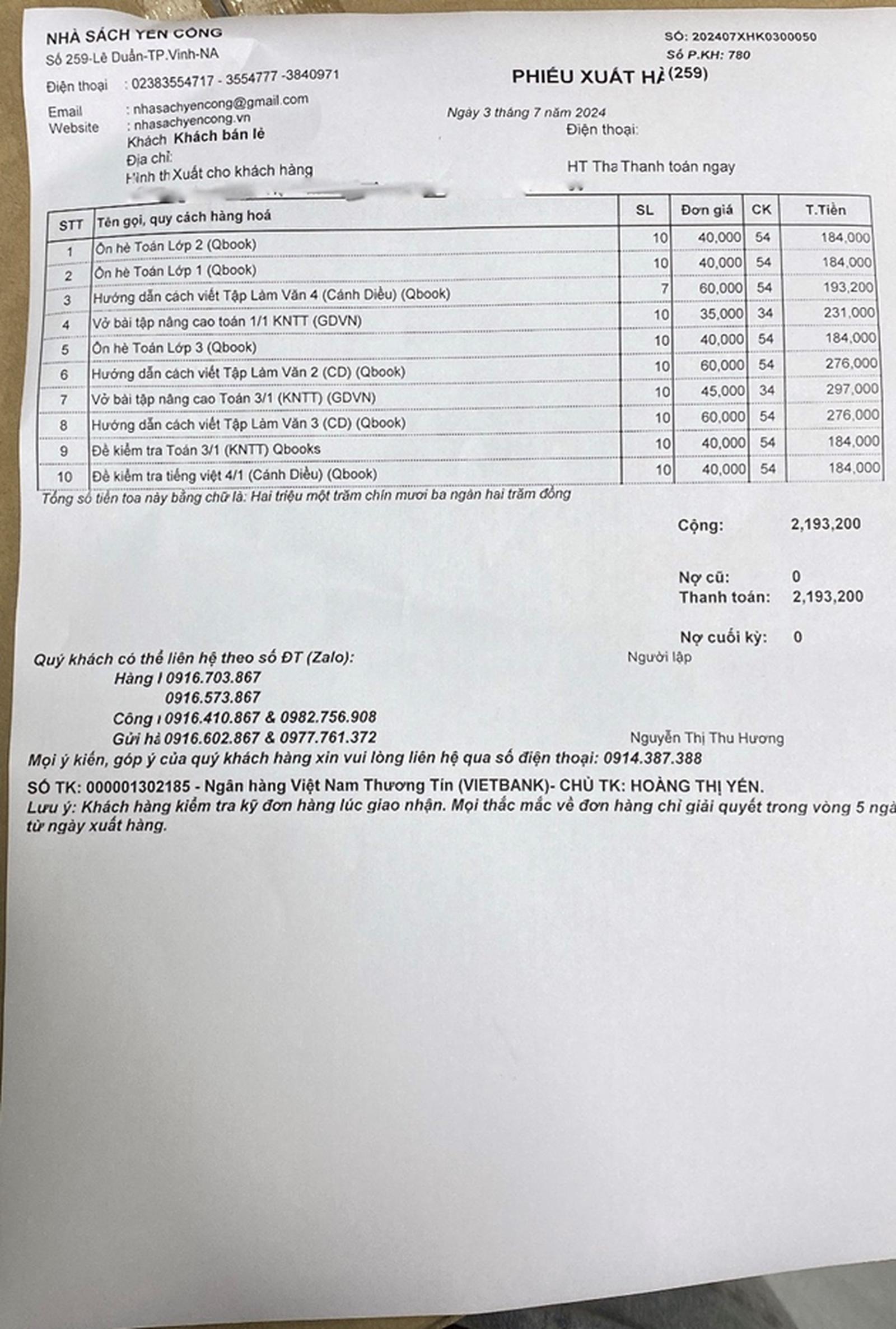 Như vậy có thể thấy, lượng sách nhà sách Yến Công nhập từ Công ty Qbooks là rất lớn. Bên cạnh đó, với chính sách giảm giá từ số lượng nhỏ cho khách hàng, trên địa bàn, khó có cơ sở kinh doanh nào có thể cạnh tranh sách bài tập, sách tham khảo này với nhà sách Yến Công.