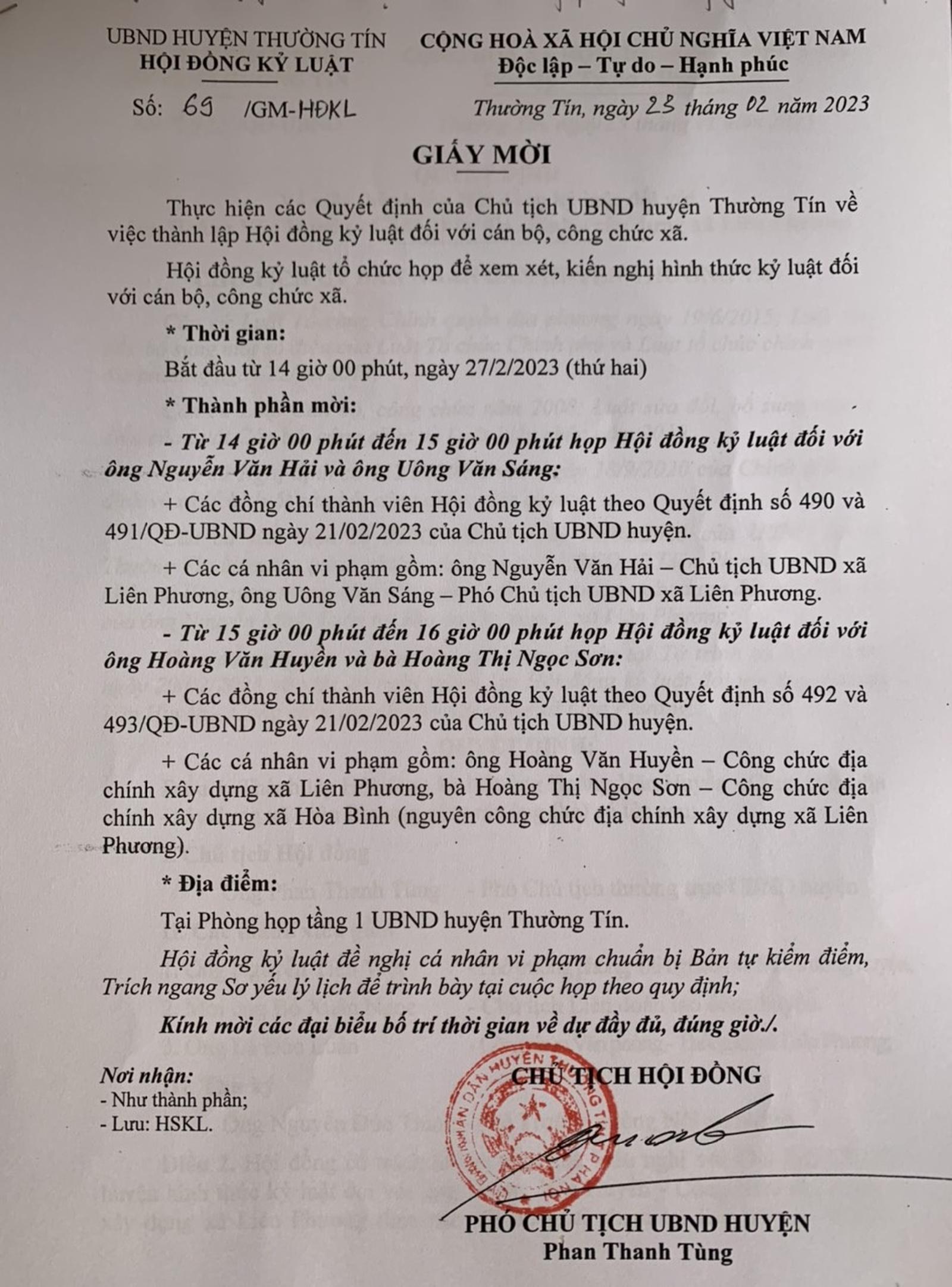 Ngày 2/3/2023, trao đổi với PV, ông Nguyễn Tiến Việt, Phó trưởng Phòng TN&MT huyện Thường Tín - Thành viên Hội đồng Kỷ luật cho biết, sau khi có kết quả kiểm tra, UBND huyện đã thành lập Hội đồng Kỷ luật đối với ông Nguyễn Văn Hải - Chủ tịch UBND xã Liên Phương và một số cán bộ công chức có liên quan đến vi phạm của ông Nguyễn Minh Tuấn.