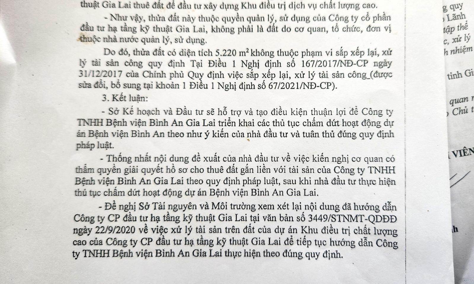 Đồng thời, nhà đầu tư này cũng bức xúc khi các sở, ngành có biên bản thống nhất sau khi nhà đầu tư thực hiện chấm dứt hoạt động dự án nhằm tháo gỡ vướng mắc thời điểm trước. Để từ đó, có những bước thủ tục hoàn tất đảm bảo tính pháp lý hơn nhằm giải quyết hồ sơ cho thuê đất gắn liền với tài sản của Công ty TNHH BV Bình An Gia Lai.