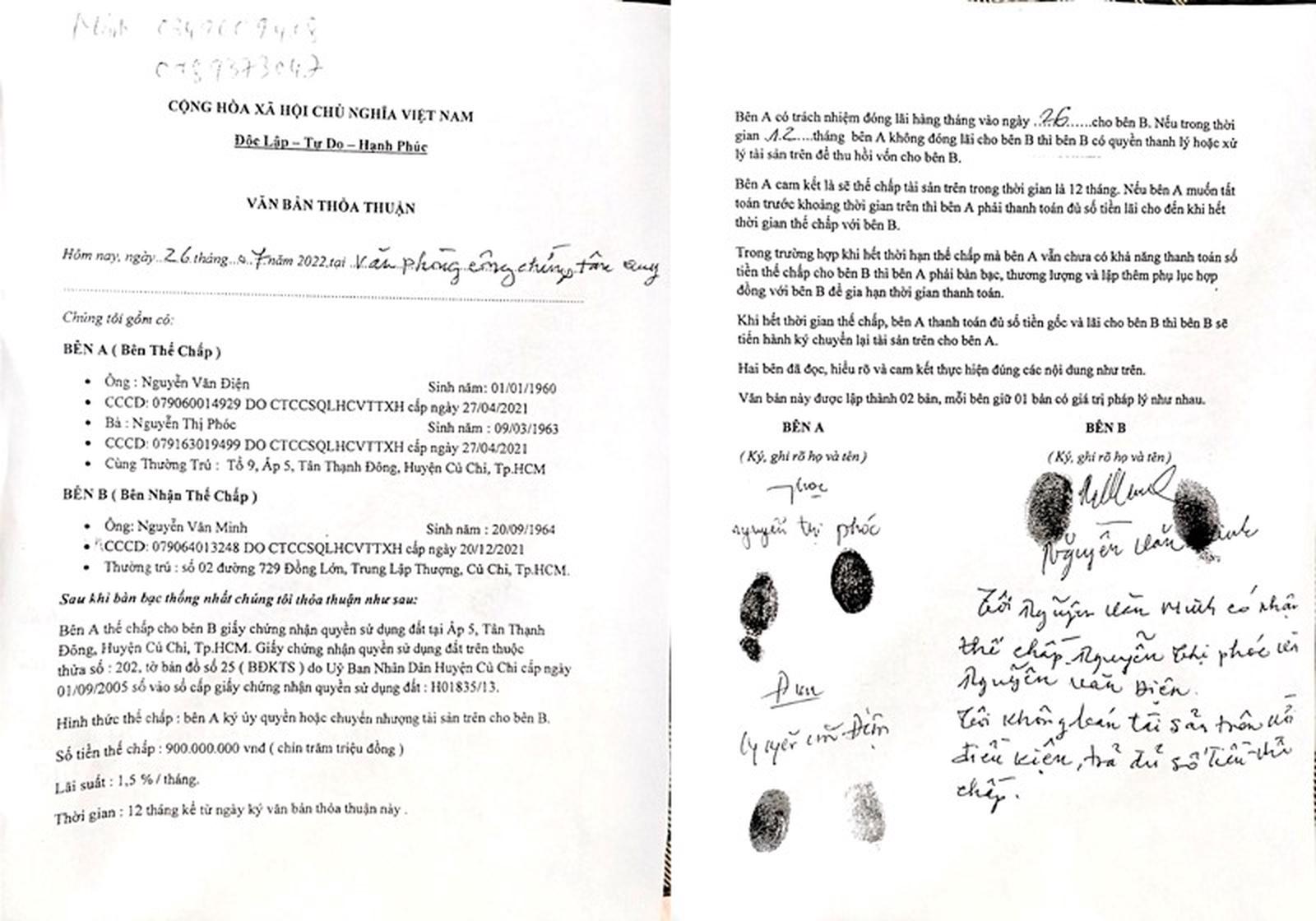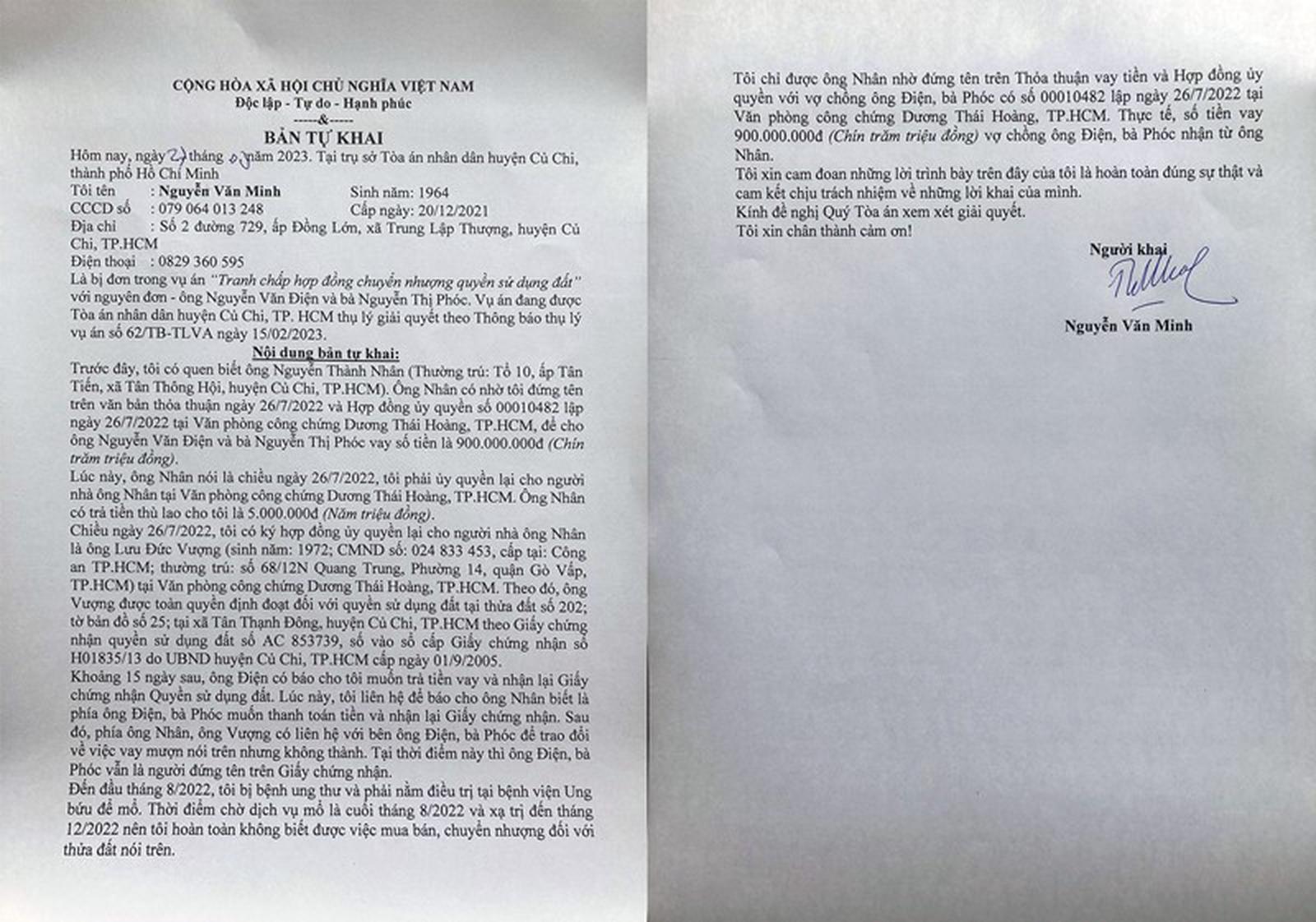 Ngày 27/3/2023, khi làm việc với Tòa án Nhân dân huyện Củ Chi, ông Minh đã tường trình lại vụ việc tại “Bản tự khai” của mình. Ông Minh cho biết mình chỉ là người được ông Nguyễn Thành Nhân (ngụ tổ 10, ấp Tân Tiến, xã Tân Thông Hội, huyện Củ Chi) nhờ đứng tên tại “văn bản thỏa thuận” và “hợp đồng ủy quyền” ngày 26/7/2022 được ký kết giữa ông với vợ chồng ông Điện, bà Phóc với nội dung: Ông Minh cho ông Điện, bà Phóc vay 900 triệu đồng, với lãi suất 1,5%/tháng, thời gian vay là 12 tháng. Đổi lại ông Điện, bà Phóc trả lãi hàng tháng cho ông Minh đúng hẹn vào ngày 26 hàng tháng.