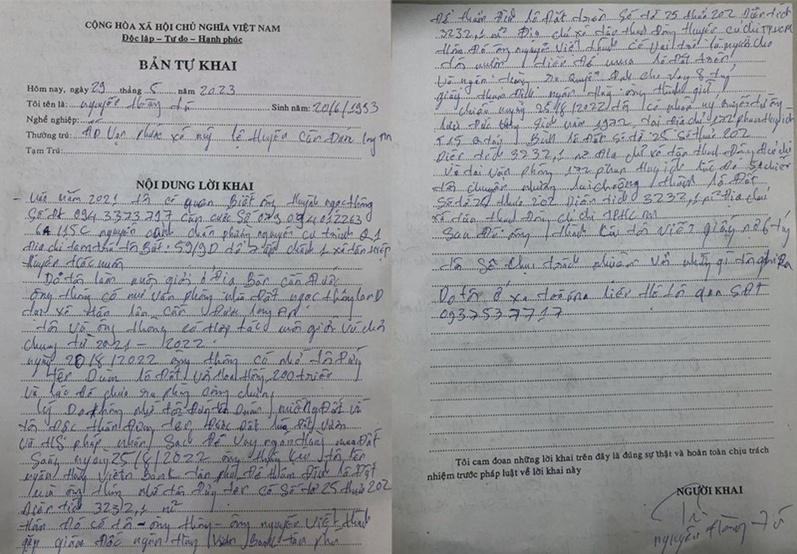 Mặt khác, khi được Tòa án Nhân dân huyện Củ Chi triệu tập vì có liên quan đến vụ việc, ông Nguyễn Hoàng Tú (người mua đất với giá 5 tỷ đồng từ ông Vượng - PV) cũng làm “Bản tự khai” trước tòa rằng, ông chỉ là người được ông Huỳnh Ngọc Thông (phường Nguyễn Cư Trinh, quận 1, TP Hồ Chí Minh) và ông Nguyễn Việt Thành (quận 8, TP Hồ Chí Minh) nhờ đứng tên để mua lại thửa đất của gia đình ông Điện với mức “thù lao” ông Tú được ông Thông, ông Thành trả là 200 triệu đồng.