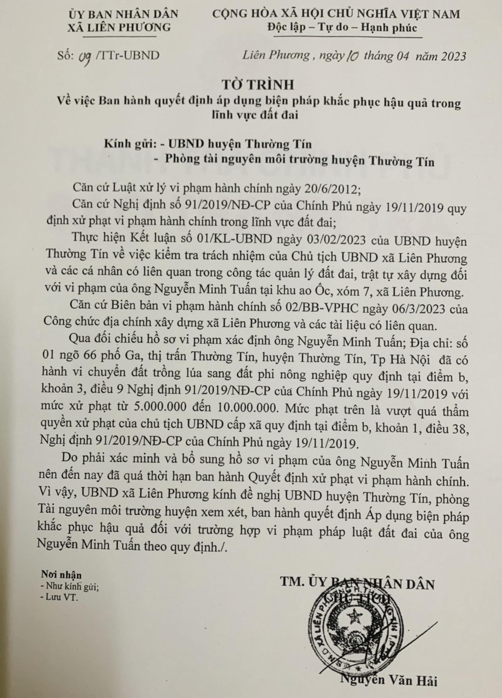 Theo ông Hải, do phải xác minh và bổ sung hồ sơ vi phạm của ông Nguyễn Minh Tuấn, nên đến nay đã quá thời hạn ban hành quyết định xử phạt vi phạm hành chính. Vì vậy, UBND xã Liên Phương đã có tờ trình, đề nghị UBND huyện và Phòng TN&MT huyện Thường Tín xem xét, ban hành quyết định áp dụng biện pháp khắc phục hậu quả đối với trường hợp vi phạm pháp luật đất đai của ông Nguyễn Minh Tuấn theo quy định.
