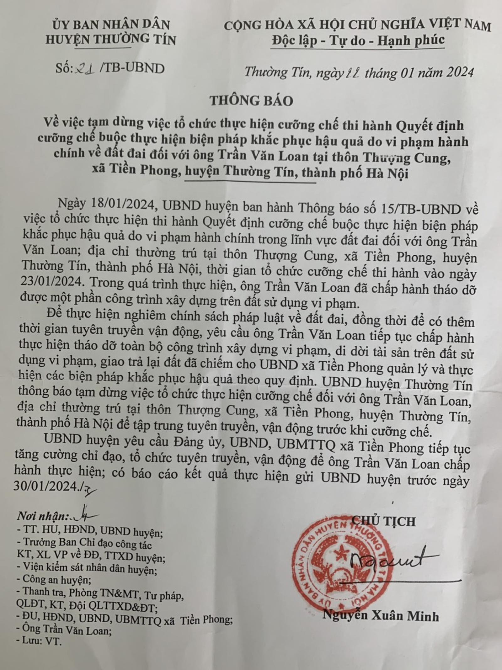Qua tìm hiểu chúng tôi được biết, sau khi ông Loan có đơn khiếu nại, ngày 22/1/2024, Chủ tịch UBND huyện Thường Tín, ông Nguyễn Xuân Minh đã ban hành Thông báo số 21/TB-UBND về việc tạm dừng thực hiện cưỡng chế thi hành Quyết định cưỡng chế buộc thực hiện biện pháp khắc phục hậu quả do vi phạm hành chính về đất đai đối với ông Trần Văn Loan tại thôn Thượng Cung, xã Tiền Phong.