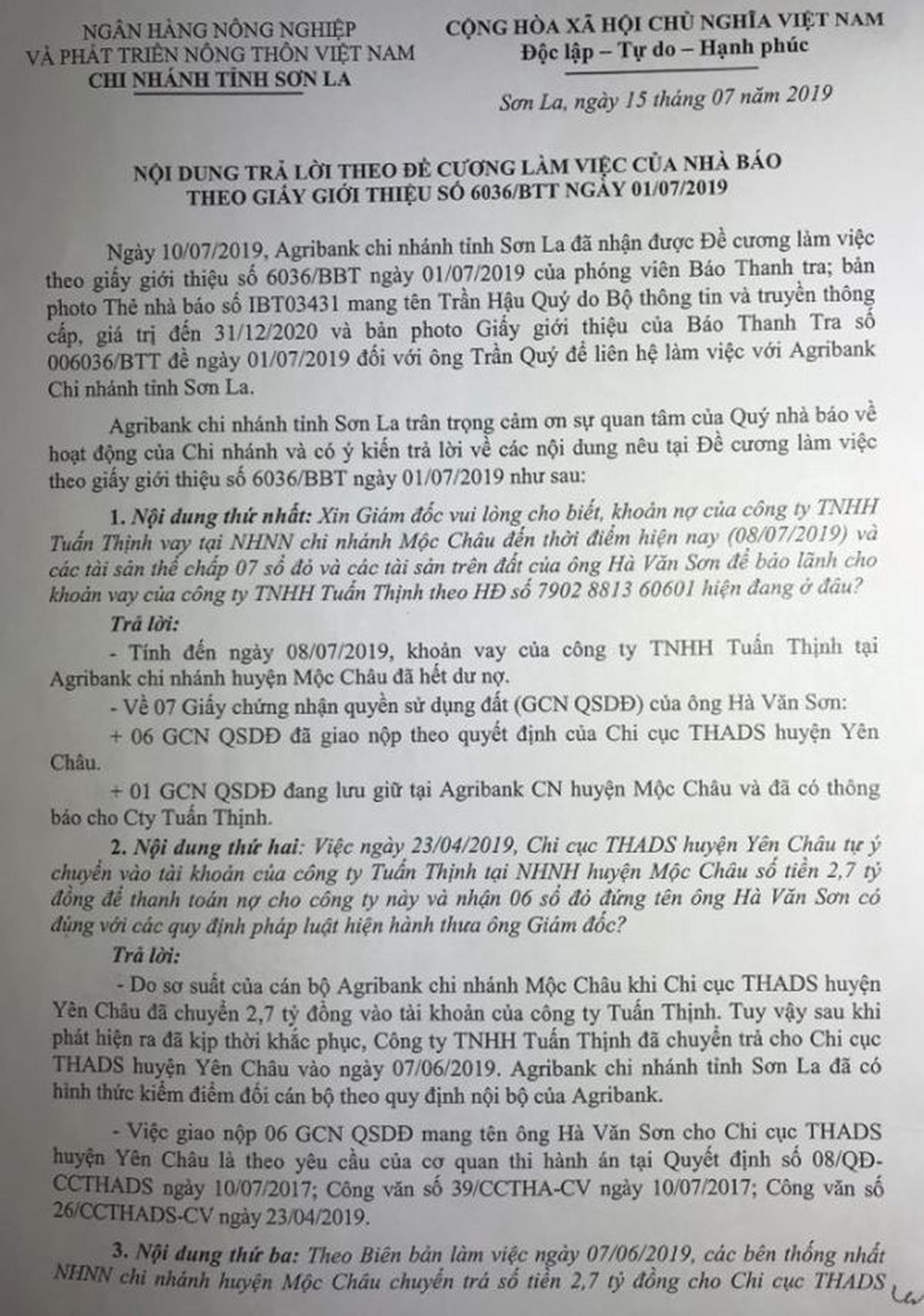 Ngày 28/6/2019, Cục THADS tỉnh Sơn La có văn bản số 299/CTHADS-NV về việc phản hồi thông tin báo chí, gửi Báo Thanh tra. Theo nội dung văn bản, thì một số nội dung bài viết thông tin chưa chính xác, đồng thời khẳng định, việc Chi cục THADS huyện Yên Châu chuyển vào tài khoản của Công ty Tuấn Thịnh tại Ngân hàng Nông nghiệp và Phát triển nông thôn (Agribank) chi nhánh huyện Mộc Châu số tiền 2,7 tỷ đồng, để thanh toán nợ cho Cty này, sau đó nhận 6 giấy chứng nhận quyền sử dụng đất (sổ đỏ) đứng tên ông Hà Văn Sơn, là tài sản bảo đảm vay của bên thứ 3 cho Cty TNHH Tuấn Thịnh theo Hợp đồng số 7902881360601 ngày 13/6/2013, là đúng quy định pháp luật.