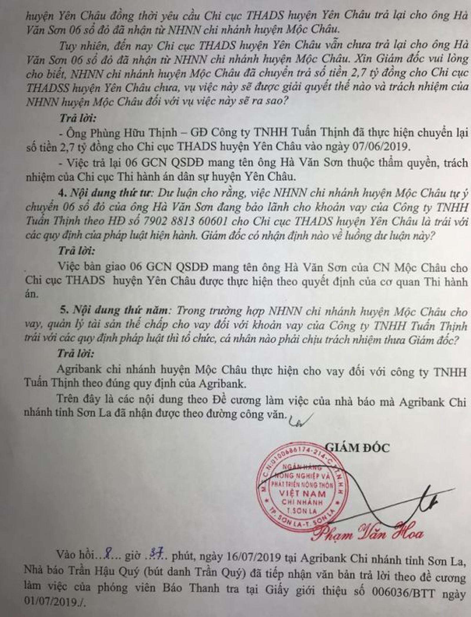 Tuy nhiên, khi PV đề nghị được biết những “sơ suất” và “phát hiện ra, đã kịp thời khắc phục” của cán bộ Agribank chi nhánh Mộc Châu, cũng như hình thức, mức độ kỷ luật đối với cán bộ đó của Agribank tỉnh Sơn La; vì sao Chi cục THADS huyện Yên Châu chỉ nhận 6/7 sổ đỏ của ông Sơn tại Agribank chi nhánh huyện Mộc Châu; 1 sổ đỏ đang ở Agribank chi nhánh huyện Mộc Châu có bảo đảm cho khoản vay nào và một số nội dung khác, thì ông Bằng từ chối với lý do: “Tôi được ủy quyền của Giám đốc Agribank tỉnh Sơn La chỉ trả lời những câu hỏi mà PV gửi đến trước đó, không trả lời gì thêm”!?