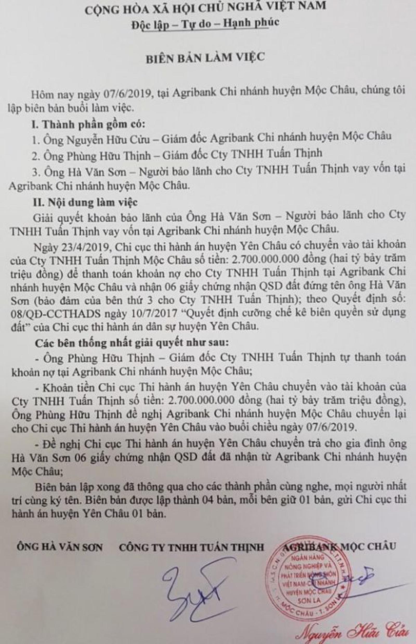 Thế nhưng, theo biên bản làm việc ngày 7/6/2019 giữa ông Nguyễn Hữu Cửu, Giám đốc Agribank chi nhánh huyện Mộc Châu với ông Phùng Hữu Thịnh, Giám đốc Công ty TNHH Tuấn Thịnh và ông Hà Văn Sơn (người bảo lãnh cho Công ty TNHH Tuấn Thịnh vay vốn tại Agribank chi nhánh huyện Mộc Châu), các bên thống nhất, Agribank chi nhánh huyện Mộc Châu chuyển trả số tiền 2,7 tỷ đồng cho Chi cục THADS huyện Yên Châu, đồng thời yêu cầu Chi cục THADS huyện Yên Châu trả lại cho ông Hà Văn Sơn 6 sổ đỏ đã nhận từ Agribank chi nhánh huyện Mộc Châu.