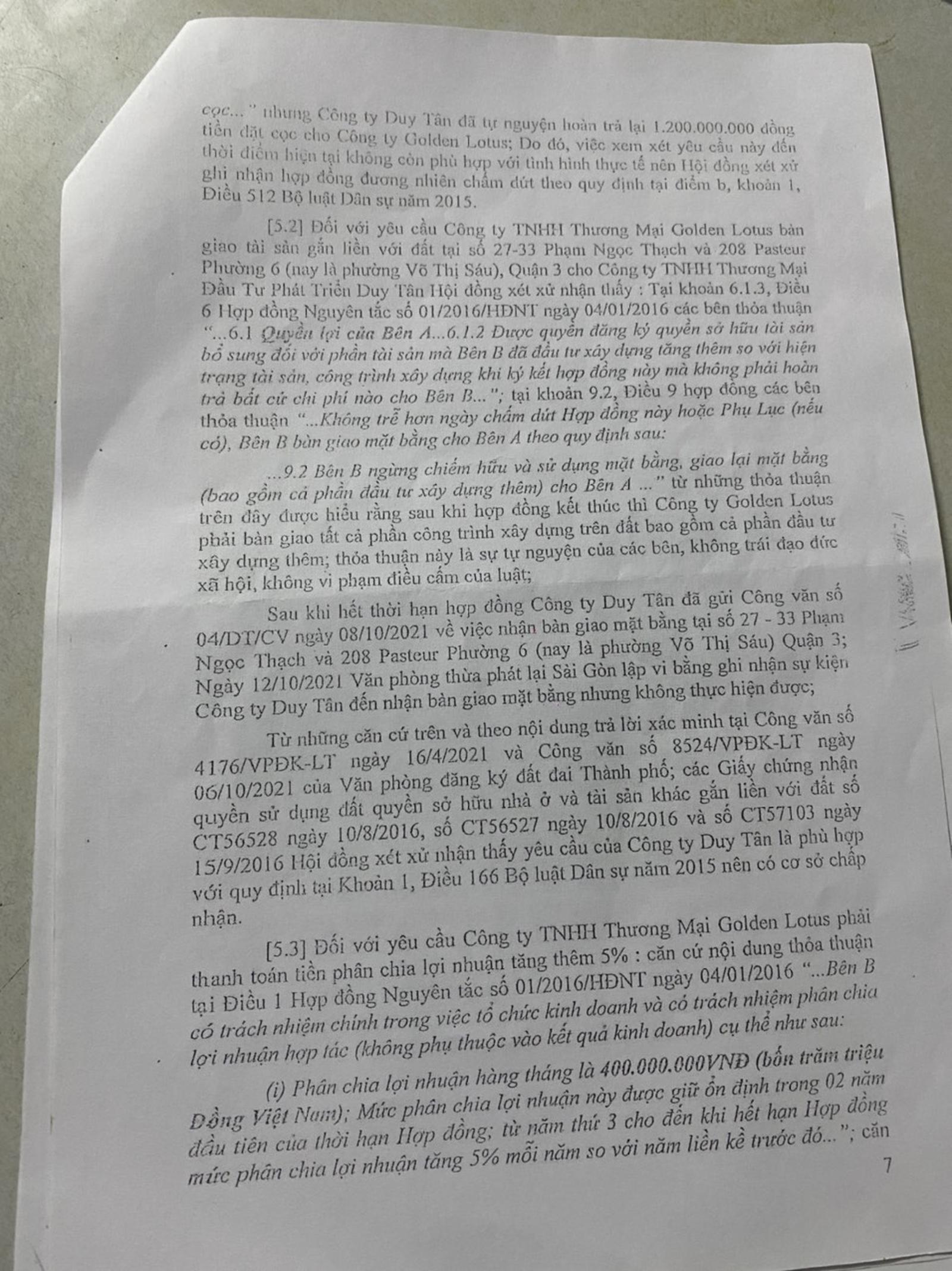 Tại phiên xét xử sơ thẩm ngày 21/12/2021, Tòa án Nhân dân quận 3 đã tuyên xử: “Đối với yêu cầu của Công ty Duy Tân, buộc Công ty Golden Lotus ngừng chiếm hữu và sử dụng, giao lại mặt bằng bao gồm cả phần đầu tư xây dựng thêm tại 27 -33 Phạm Ngọc Thạch, quận 3, TP Hồ Chí Minh, Hội đồng Xét xử nhận thấy yêu cầu của Công ty Duy Tân là phù hợp với quy định tại khoản 1, Điều 166 Bộ luật Dân sự năm 2015 nên có cơ sở chấp nhận”.