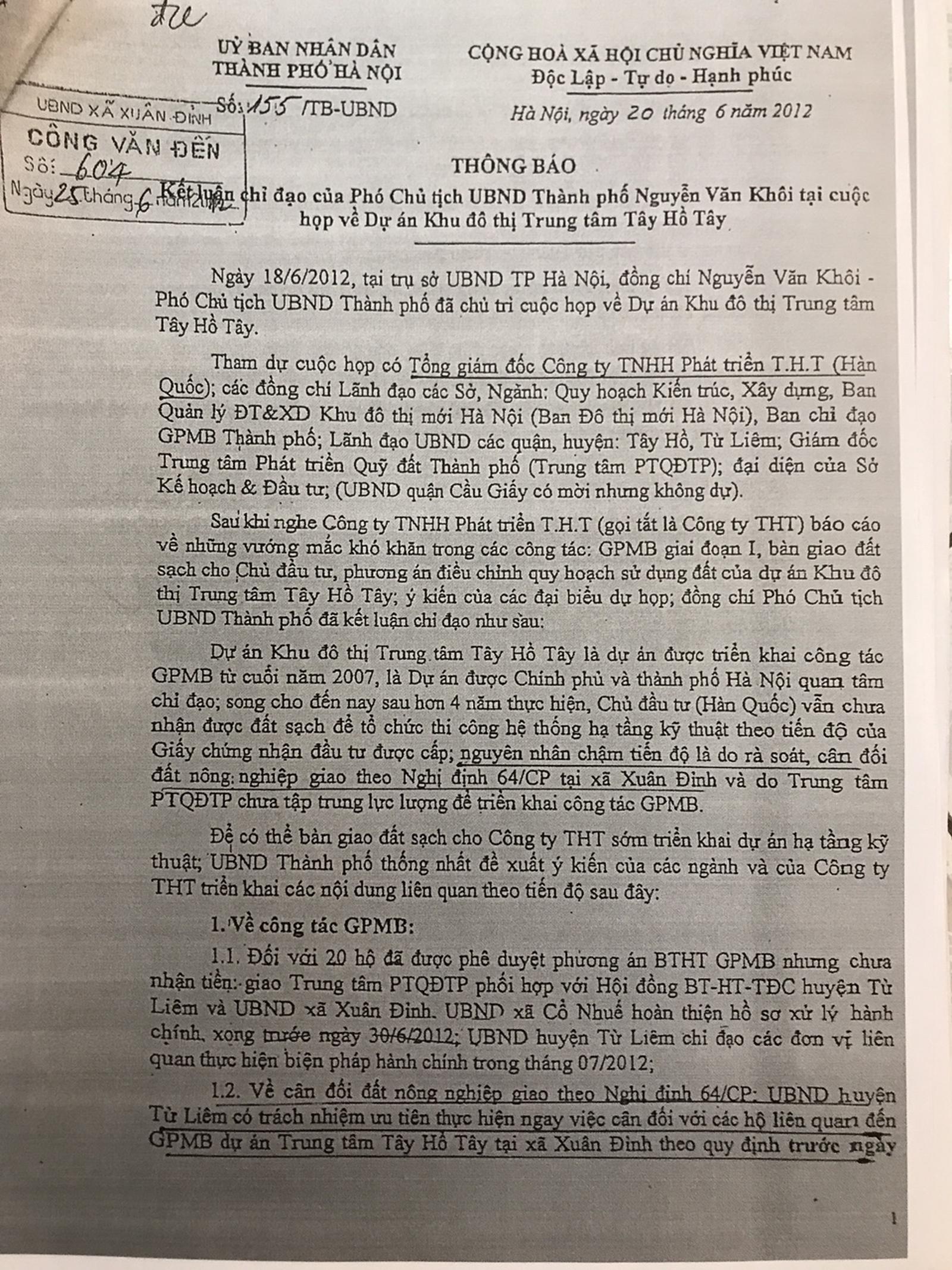 “3. Đối với diện tích đất nông nghiệp không giao do 07 hộ gia đình, cá nhân đang sử dụng: Giao UBND xã Xuân Đỉnh chỉ đạo Tổ công tác GPMB tiếp tục điều tra, kiểm đếm theo quy định. UBND xã Xuân Đỉnh có trách nhiệm rà soát diện tích cân đối cho các hộ thiếu diện tích khi thực hiện Nghị định 64/CP trên địa bàn xã, báo cáo Phòng Tài nguyên và Môi trường thẩm định, trình UBND huyện quyết định. Thời gian hoàn thành: Xong trước ngày 30/10/2011. Phần diện tich còn lại lập phương án BTHT theo quy định.” (Thông báo số 561/TB-UBND ngày 13/10/2011 do ông Nguyễn Hữu Tuyên - Chánh Văn phòng UBND huyện Từ Liêm kí, hiện nay ông Tuyên là Chủ tịch HĐND quận Bắc Từ Liêm).