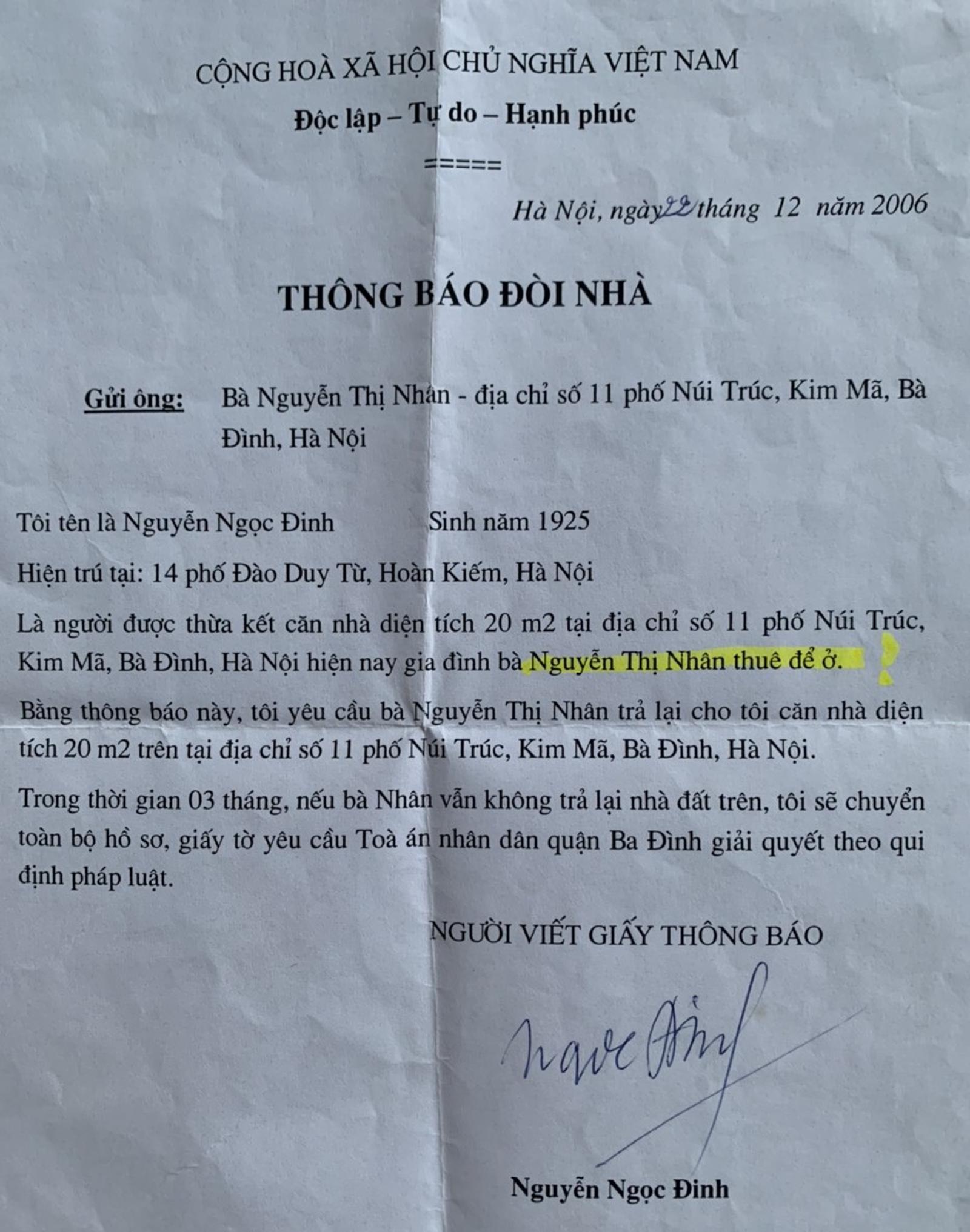 “Thông báo đòi nhà” ngày 22/12/2006 của cụ Nguyễn Ngọc Đinh ghi là cụ Nhân thuê nhà để ở. Ảnh: TQ