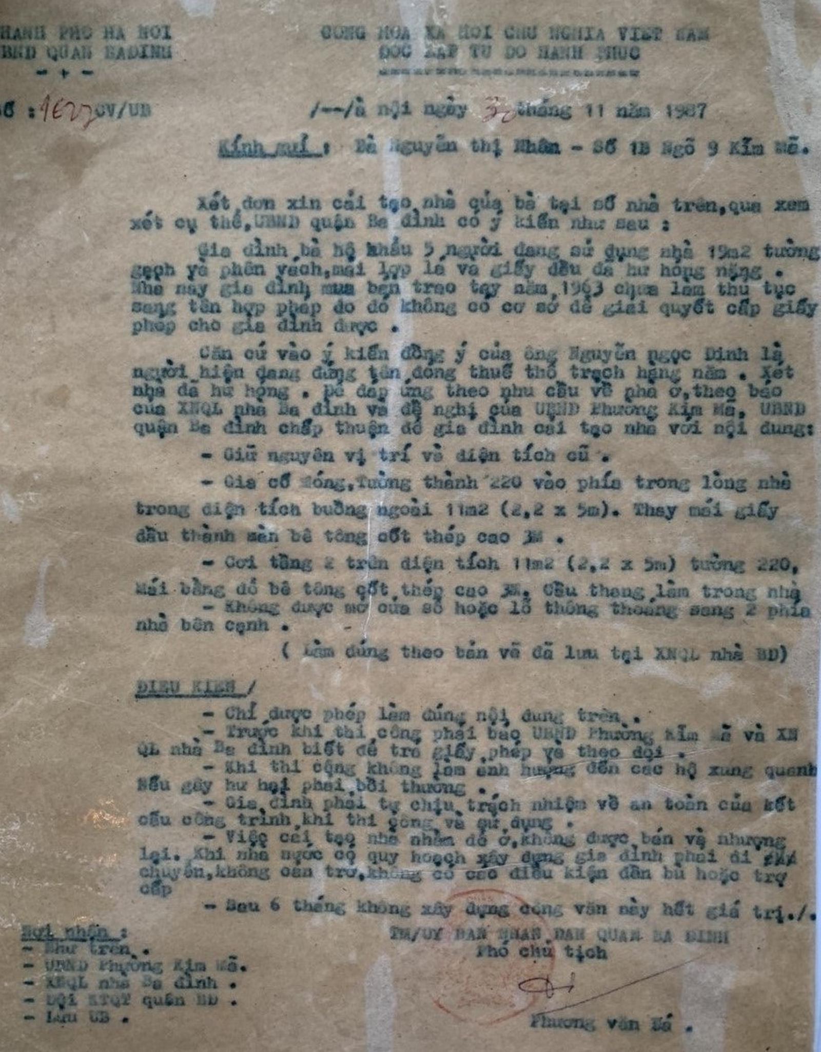 UBND quận Ba Đình không cấp phép xây dựng mà có Công văn số 1627/CV-UB ngày 30/11/1987 đồng ý cho gia đình cụ Nhân cải tạo nhà thành nhà 2 tầng trên diện tích 20m2. Năm 2011 gia đình tiếp tục sửa chữa lại nhà 2 tầng và làm thêm 1 tum. Tính đến nay, gia đình cụ Nhân đã sử dụng nhà đất ổn định 57 năm.