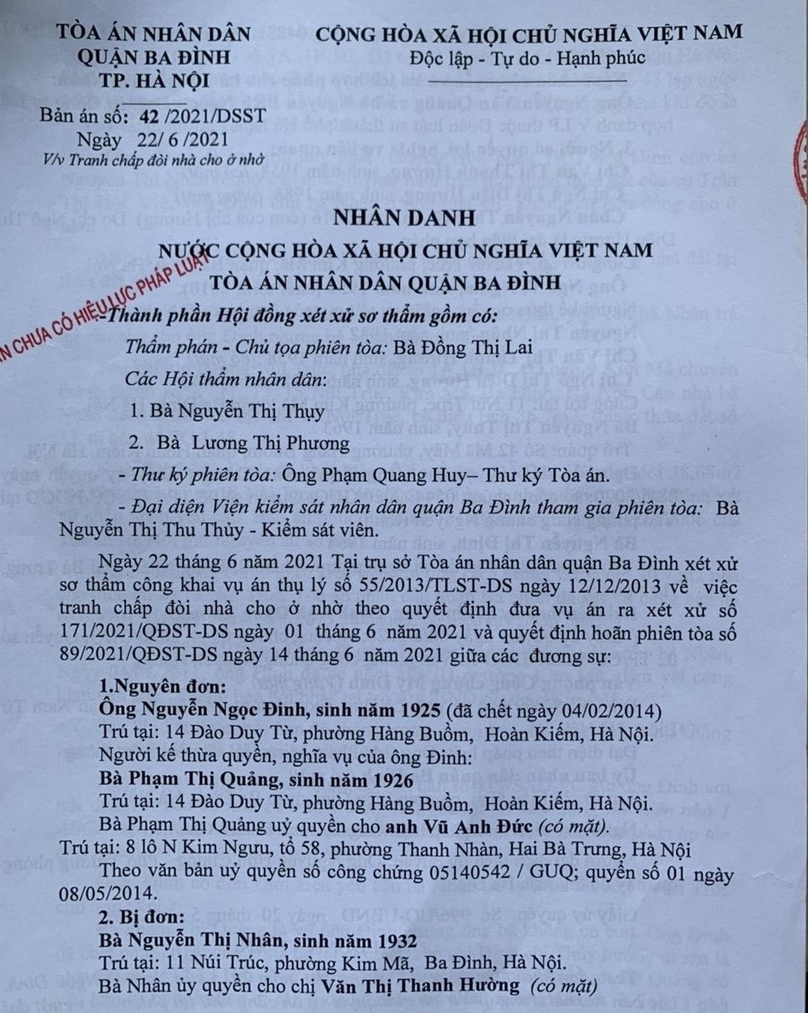 Bản án dân sự sơ thẩm số 42/2021/DSST ngày 22/6/2021 cho thấy, TAND quận Ba Đình chấp nhận yêu cầu khởi kiện của cụ Nguyễn Ngọc Đinh đối với cụ Nguyễn Thị Nhân về việc đòi nhà cho ở nhờ tại số 1B ngõ 9 Kim Mã (nay là số 11 Núi Trúc).