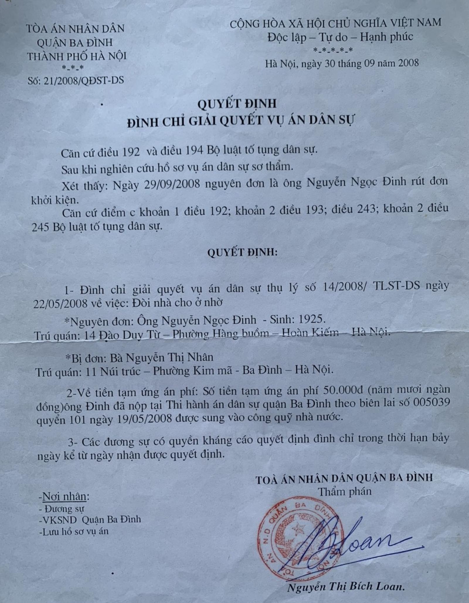 Ngày 29/9/2008, ông Đinh đã rút đơn khởi kiện nên ngày 30/9/2008, TAND quận Ba Đình, TP Hà Nội đã ra Quyết định số 21/2008/QĐST-DS đình chỉ giải quyết Vụ án dân sự thụ lý số 14/2008/TLST-DS ngày 22/5/2008 về việc “đòi nhà cho ở nhờ” giữa nguyên đơn cụ Nguyễn Ngọc Đinh và bị đơn cụ Nguyễn Thị Nhân.