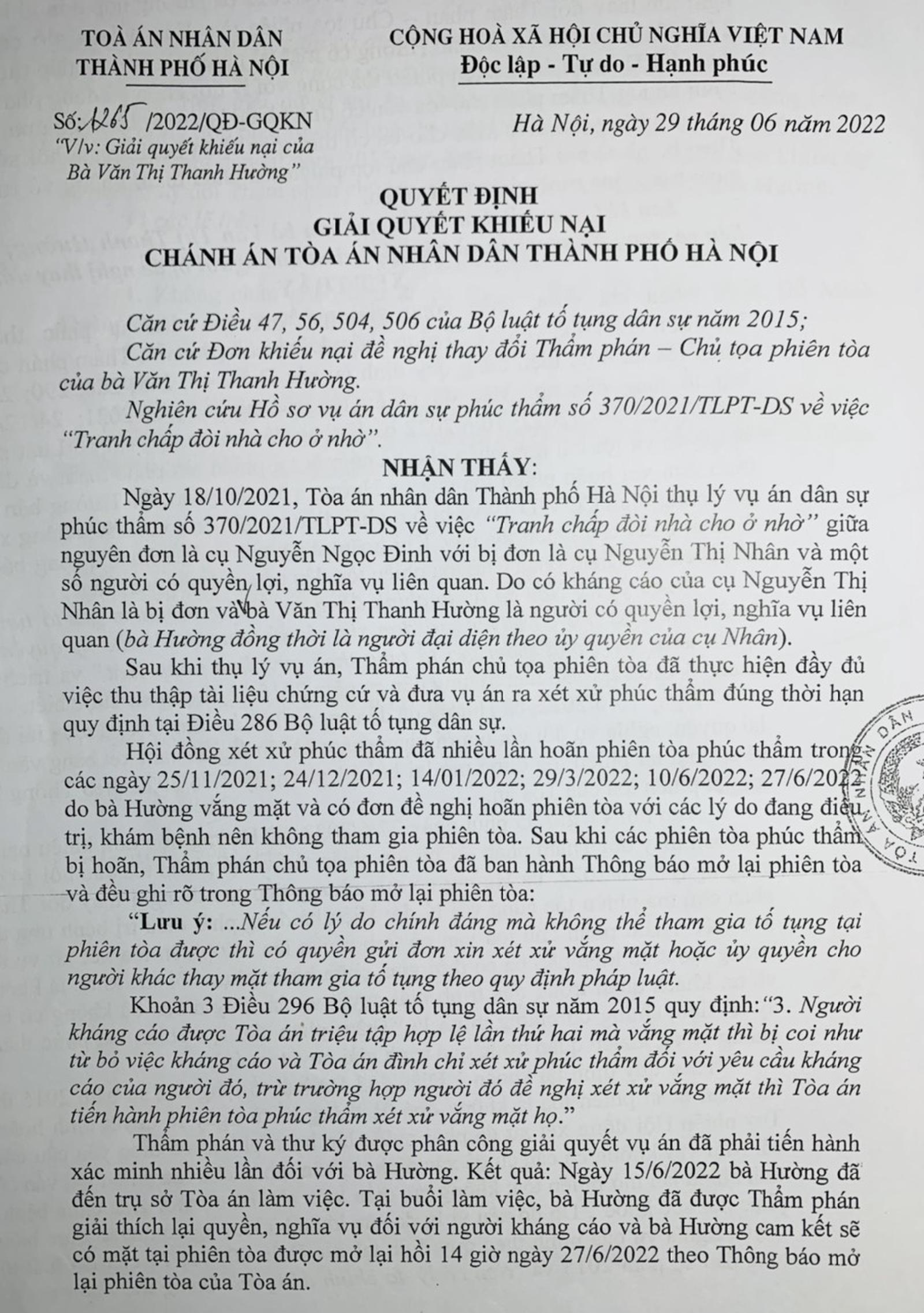 TAND TP Hà Nội quyết định: Không chấp nhận đơn khiếu nại xin thay đổi thẩm phán Đỗ Minh Hoàng (người được giao thụ lý Vụ án dân sự phúc thẩm số 370/2021/TLPT-DS về việc “tranh chấp đòi nhà cho ở nhờ”, giữa nguyên đơn cụ Nguyễn Ngọc Đinh và bị đơn cụ Nguyễn Thị Nhân) của Văn Thị Thanh Hường.