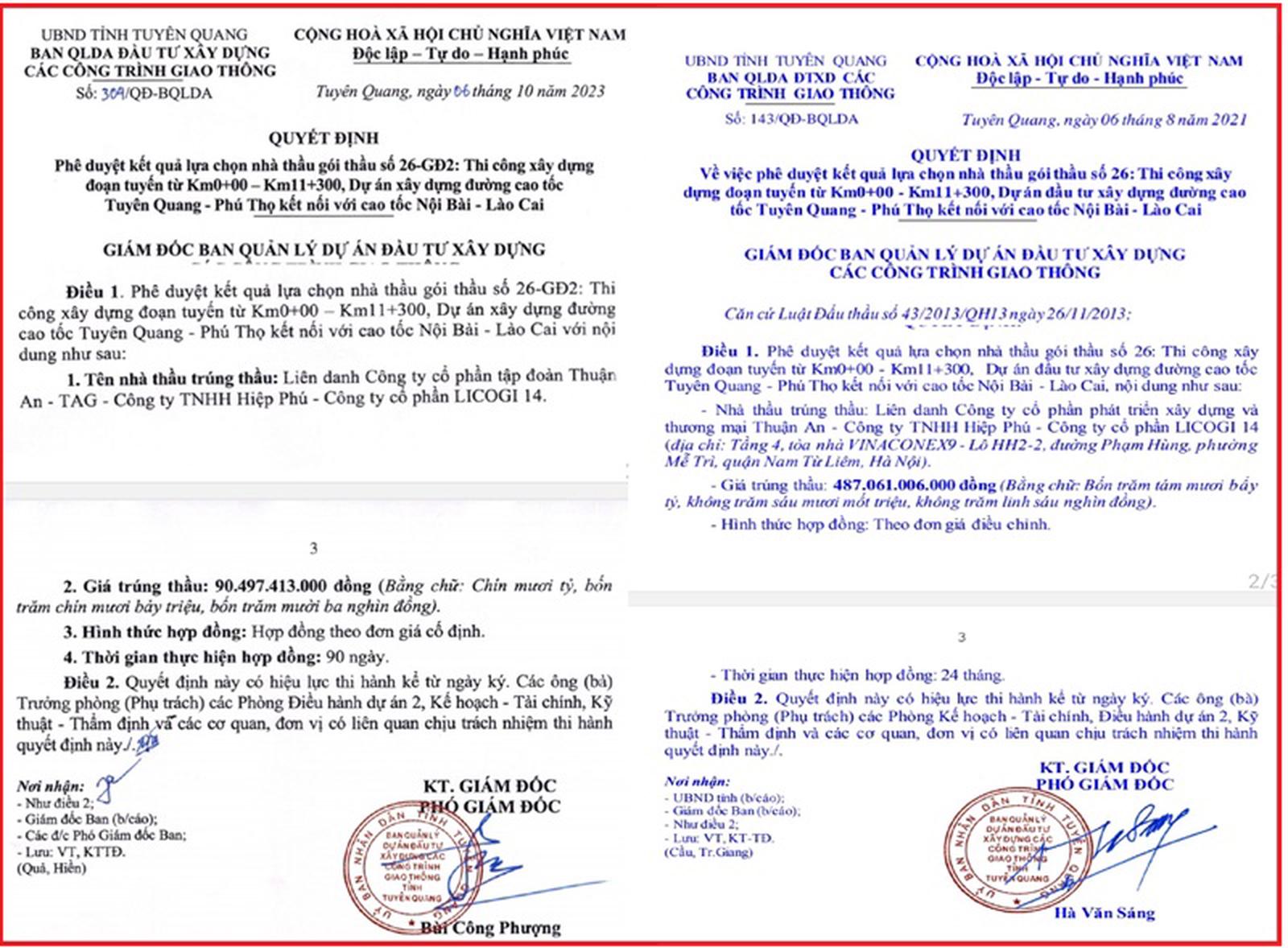 Theo kết luận của UBKT Trung ương tại Gói thầu số 26 thi công xây dựng đoạn tuyến từ Km0+00 - Km11+300 thuộc Dự án Cao tốc Phú Thọ - Tuyên Quang, do Liên danh Công ty CP Licogi 14 - Công ty CP Phát triển xây dựng và Thương mại Thuận An - Công ty TNHH Hiệp Phú được công bố trúng thầu với giá 487,061 tỷ đồng, giai đoạn 1.