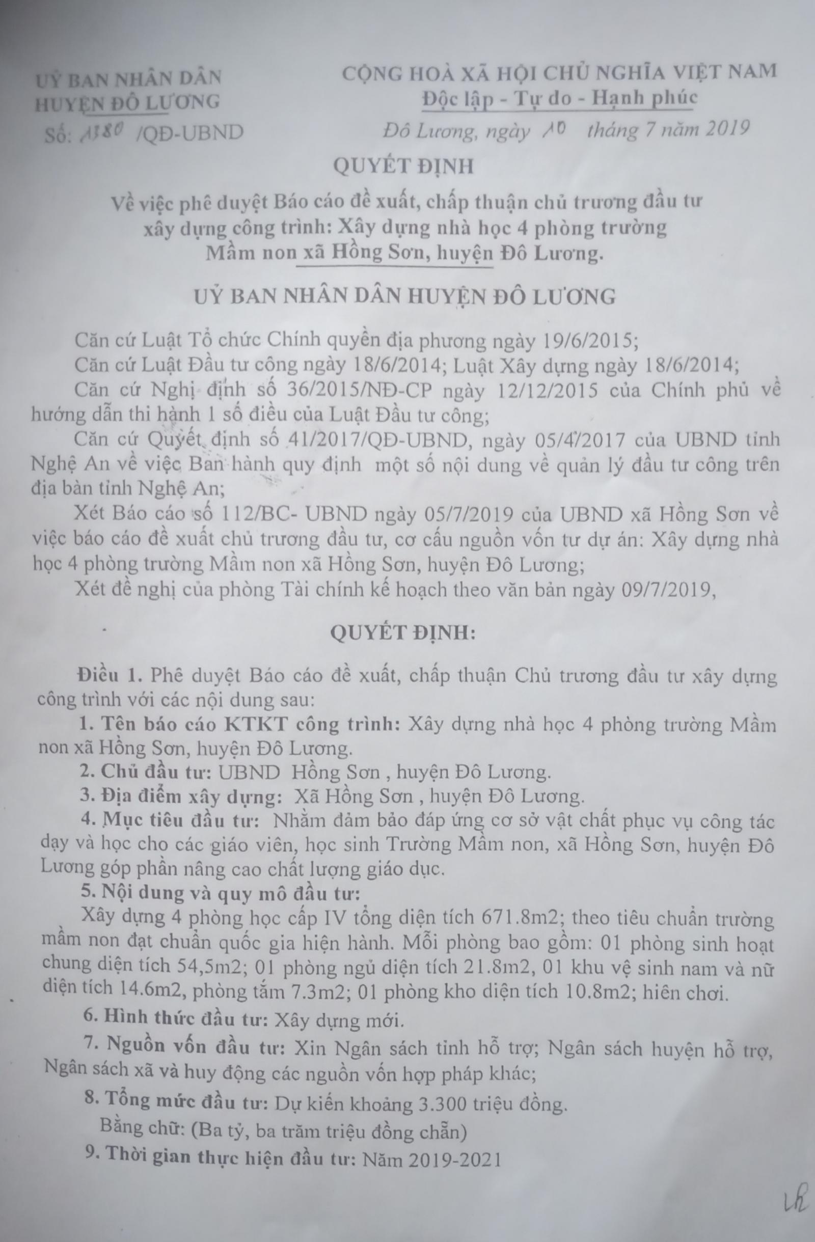 Đối với công trình xây dựng nhà học 4 phòng Trường Mầm non xã Hồng Sơn thuộc nhóm C, và ngày 10/7/2019 đã được Chủ tịch UBND huyện Đô Lương có Quyết định số 1380/QĐ-UBND phê duyệt báo cáo đề xuất, chấp thuận chủ trương đầu tư dự án.