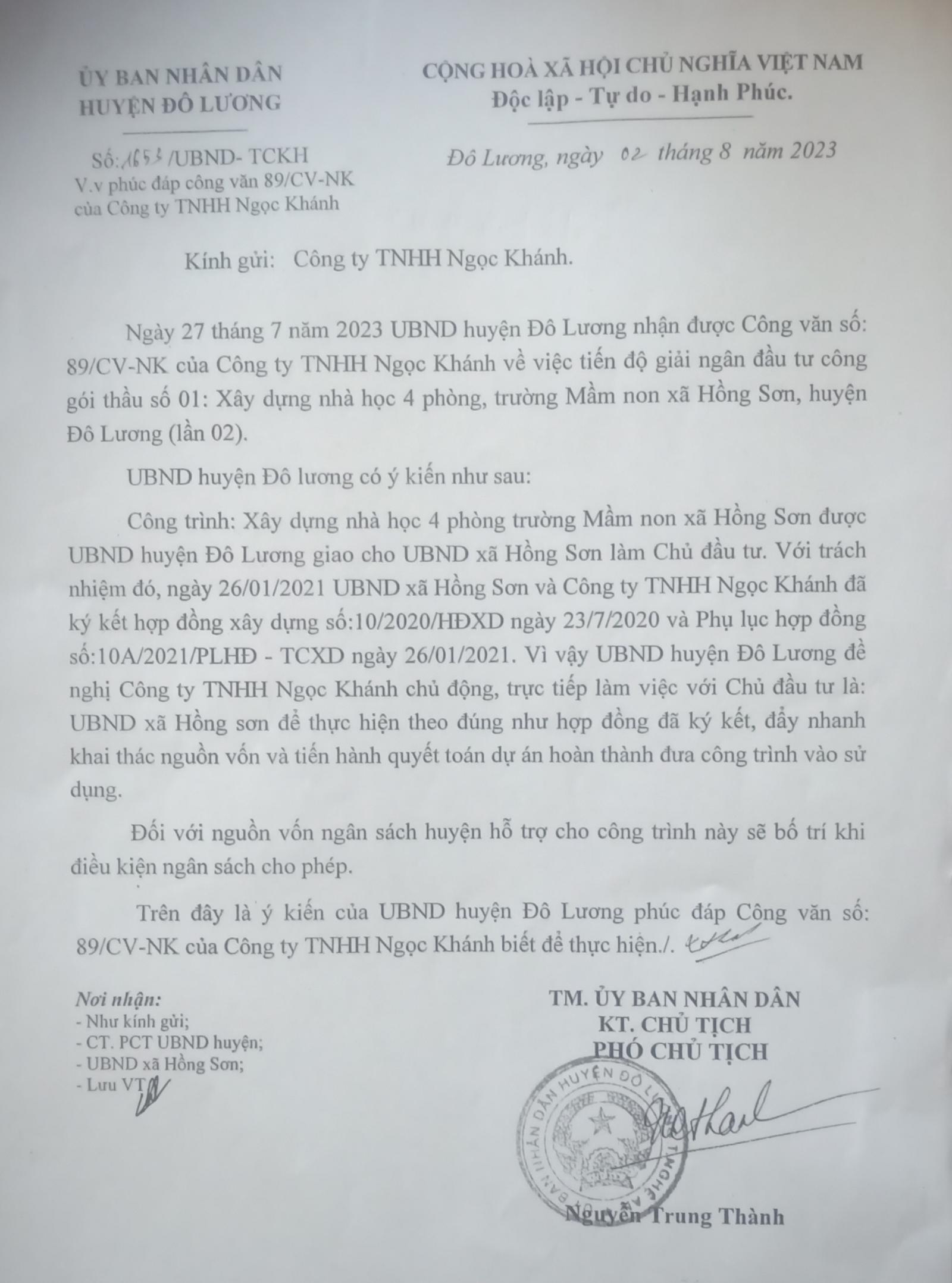 Mới đây, ngày 2/8/2023, ông Nguyễn Trung Thành, Phó Chủ tịch UBND huyện Đô Lương đã ký Văn bản số 1653/UBND-TCKH phúc đáp công văn của Công ty TNHH Ngọc Khánh, trong đó có nội dung đề nghị Công ty TNHH Ngọc Khánh chủ động, trực tiếp làm việc với chủ đầu tư là UBND xã Hồng Sơn để thực hiện theo đúng như hợp đồng đã ký kết. Đối với nguốn vốn ngân sách huyện hỗ trợ cho công trình này, huyện sẽ bố trí khi điều kiện ngân sách cho phép.