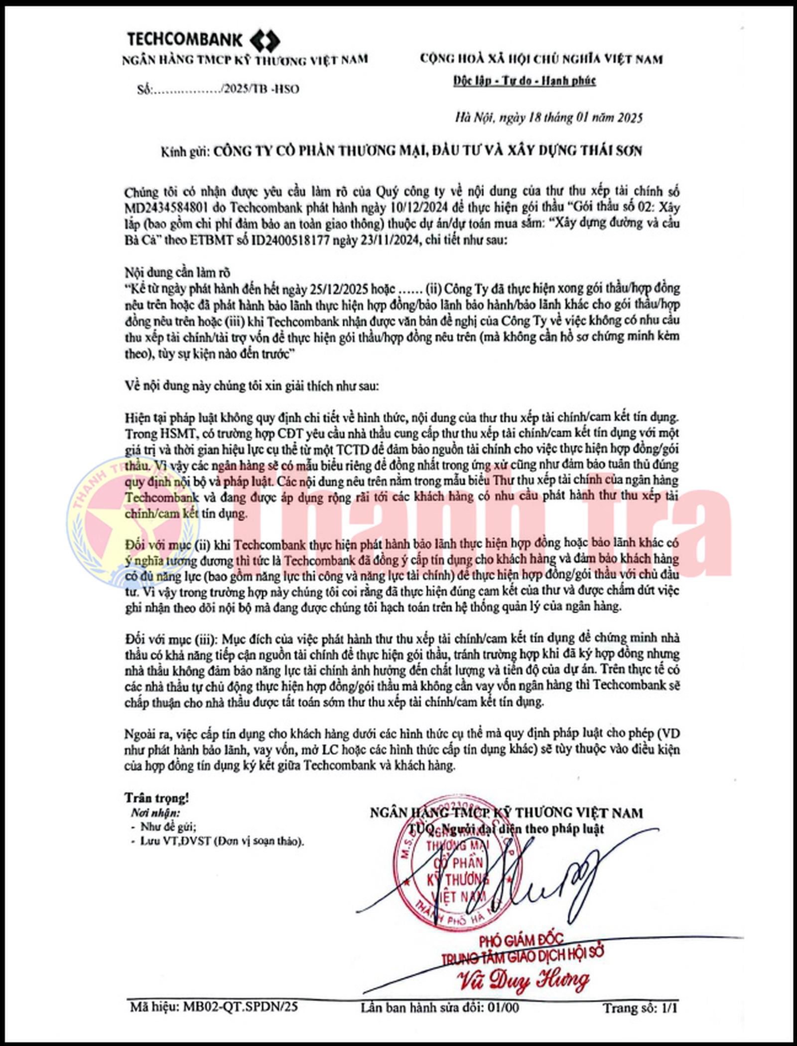 Theo đó, nhà thầu - Công ty CP Thương mại, Đầu tư và Xây dựng Thái Sơn không đồng ý kết quả đánh giá về năng lực kinh nghiệm của bên mời thầu. Đối với đánh giá nội dung cam kết tài chính của nhà thầu không đảm bảo hiệu lực thực hiện gói thầu, Công ty CP Thương mại, Đầu tư và Xây dựng Thái Sơn có đính kèm theo văn bản trả lời của Ngân hàng Techcombank do ông Vũ Huy Hưng - Phó Giám đốc Trung tâm Giao dịch hội sở ký ngày 18/1/2025.