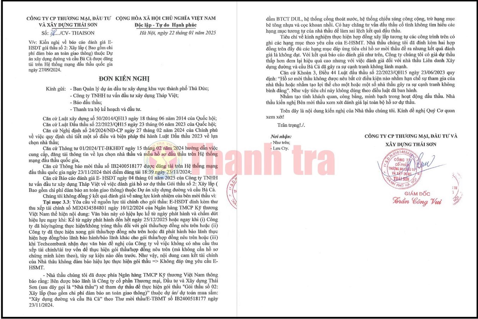 Ngay sau khi có kết quả lựa chọn nhà thầu, ngày 22/1/2025, ông Trần Công Vui - Giám đốc Công ty CP Thương mại, Đầu tư và Xây dựng Thái Sơn đã làm đơn gửi BQLDA thành phố Thủ Đức, Công ty TNHH Tư vấn đầu tư xây dựng Tháp Việt và Thanh tra Bộ Kế hoạch và Đầu tư để kiến nghị về báo cáo đánh giá hồ sơ dự thầu.