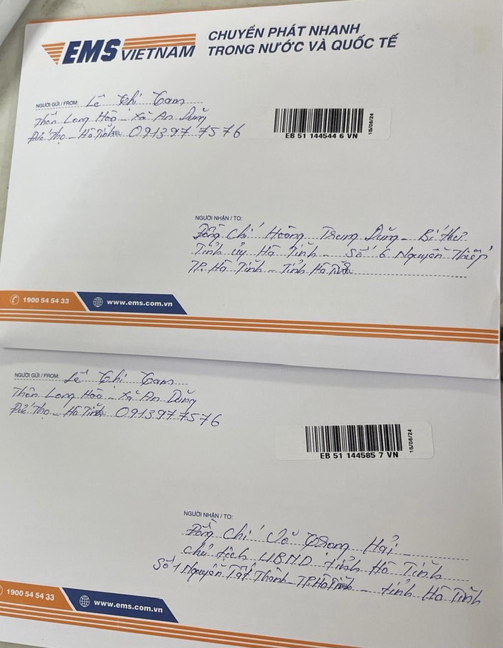 Bà Lê Thị Tam gửi đơn kiến nghị đến Bí thư và Chủ tịch UBND tỉnh Hà Tĩnh. Ảnh: Gia đình cung cấp