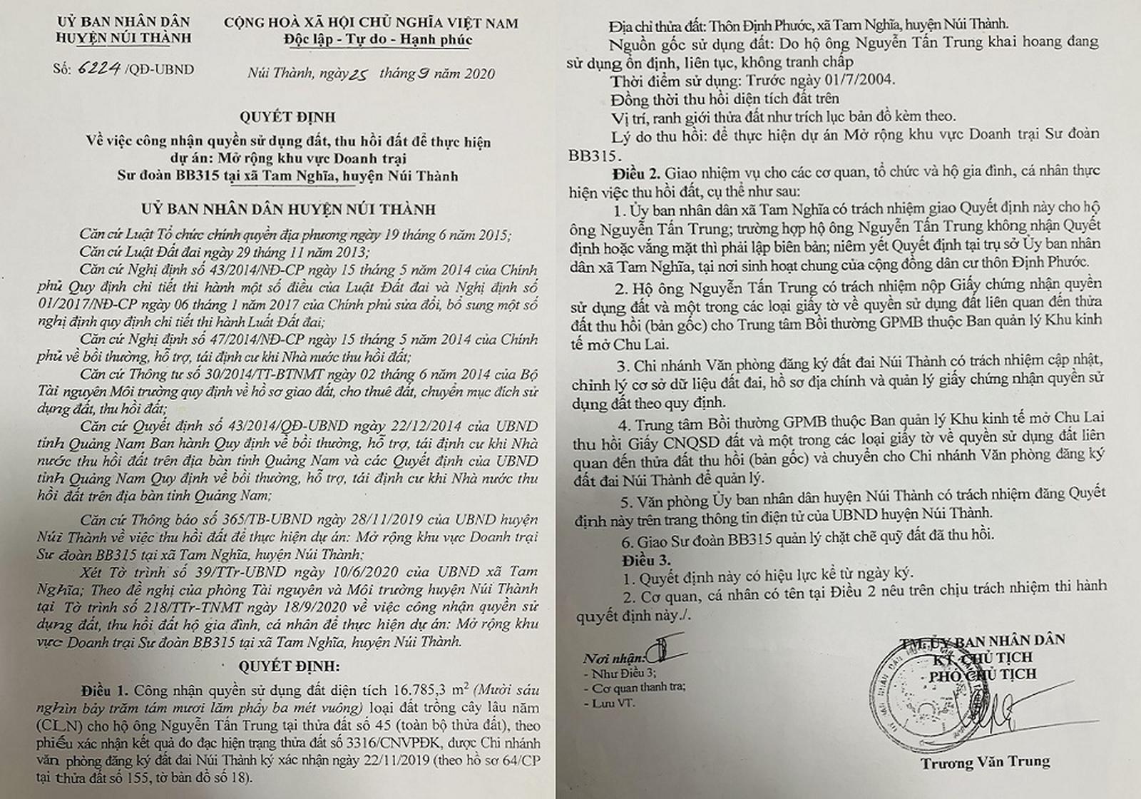 Quyết định số 6224/QĐ-UBND ngày 25/9/2020 của UBND huyện Núi Thành về việc công nhận quyền sử dụng đất, thu hồi đất của ông Trung để thực hiện Dự án. Ảnh: TQ