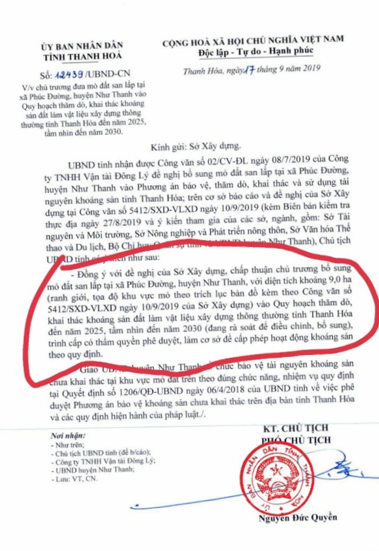 Văn bản chấp thuận chủ trương bổ sung khu vực mỏ đất san lấp tại xã Xuân Phúc, huyện Như Thanh, diện tích 8,7 ha theo đề nghị của Công ty Tiến Đạt. Ảnh: VT