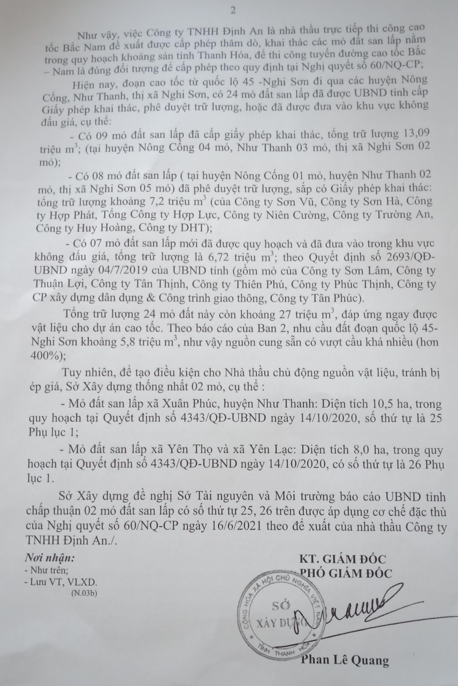 Theo báo cáo của Ban 2 được Bộ Giao thông Vận tải giao quản lý dự án thì nhu cầu đất đoạn Quốc lộ 45 - Nghi Sơn khoảng 5,8 triệu m3. Như vậy, nguồn cung sẵn có vượt cầu khoảng hơn 400%. Đồng thời, để tạo điều kiện cho nhà thầu chủ động nguồn nguyên vật liệu, tránh bị ép giá, Sở Xây dựng chỉ thống nhất áp dụng cơ chế đặc thù của Nghị quyết số 60/NQ-CP ngày 16/6/2021 chấp thuận cho Cty Định An đối với 2 mỏ đất san lấp xã Xuân Phúc, huyện Như Thanh, diện tích 10,5 ha và mỏ đất san lấp xã Yên Thọ và Yên Lạc, diện tích 8 ha trong quy hoạch (không có 2 mỏ ở xã Xuân Phúc đã chấp thuận vào quy hoạch khoáng sản hoặc phương án bảo vệ, thăm dò, khai thác và sử dụng tài nguyên khoáng sản tỉnh Thanh Hóa trên cơ sở đề xuất của Cty Đông Lý và Cty Tiến Đạt).