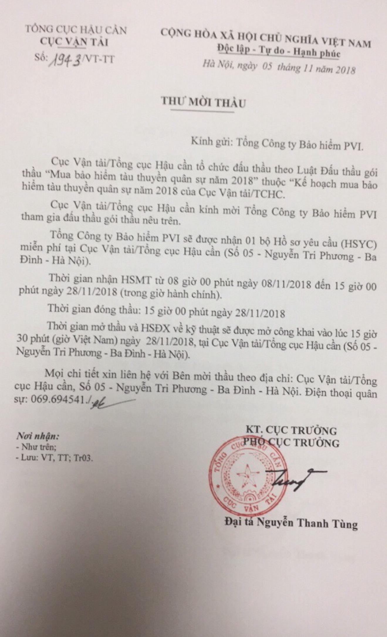 Thư mời thầu của Cục Vận tải, Tổng cục Hậu cần ngày 5/11/2018