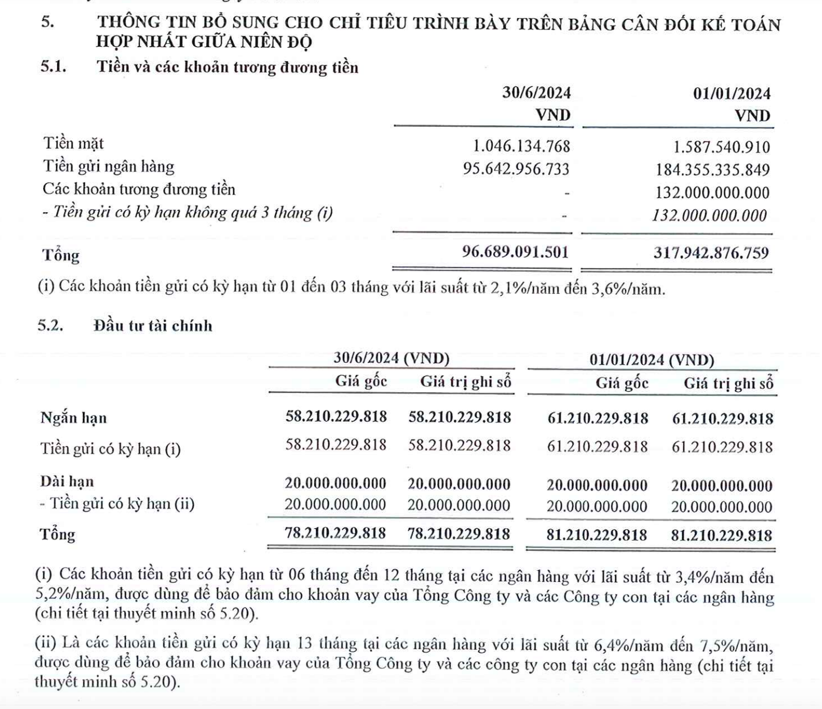 Tiền gửi có kỳ hạn từ 6 tháng đến 12 tháng có 58 tỷ đồng. Tiền gửi có kỳ hạn hơn 12 tháng có 20 tỷ đồng. Đáng nói, các khoản tiền có kỳ hạn hiện đang được công ty sử dụng làm tài sản đảm bảo cho các khoản vay của tổng công ty và các công ty con tại ngân hàng.