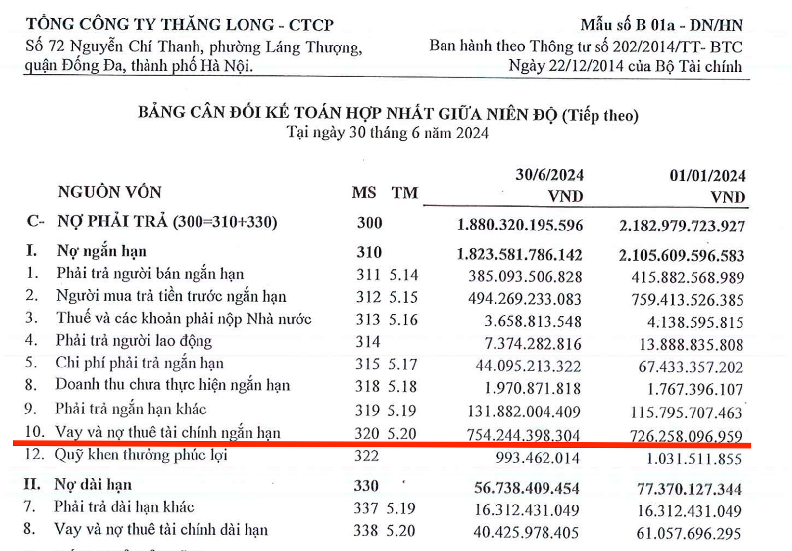 Nợ vay ngắn hạn tại Tổng công ty Thăng Long lên đến hơn 754 tỷ đồng. Ảnh: Chụp màn hình.