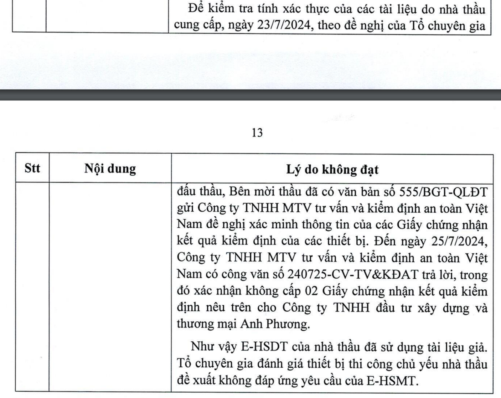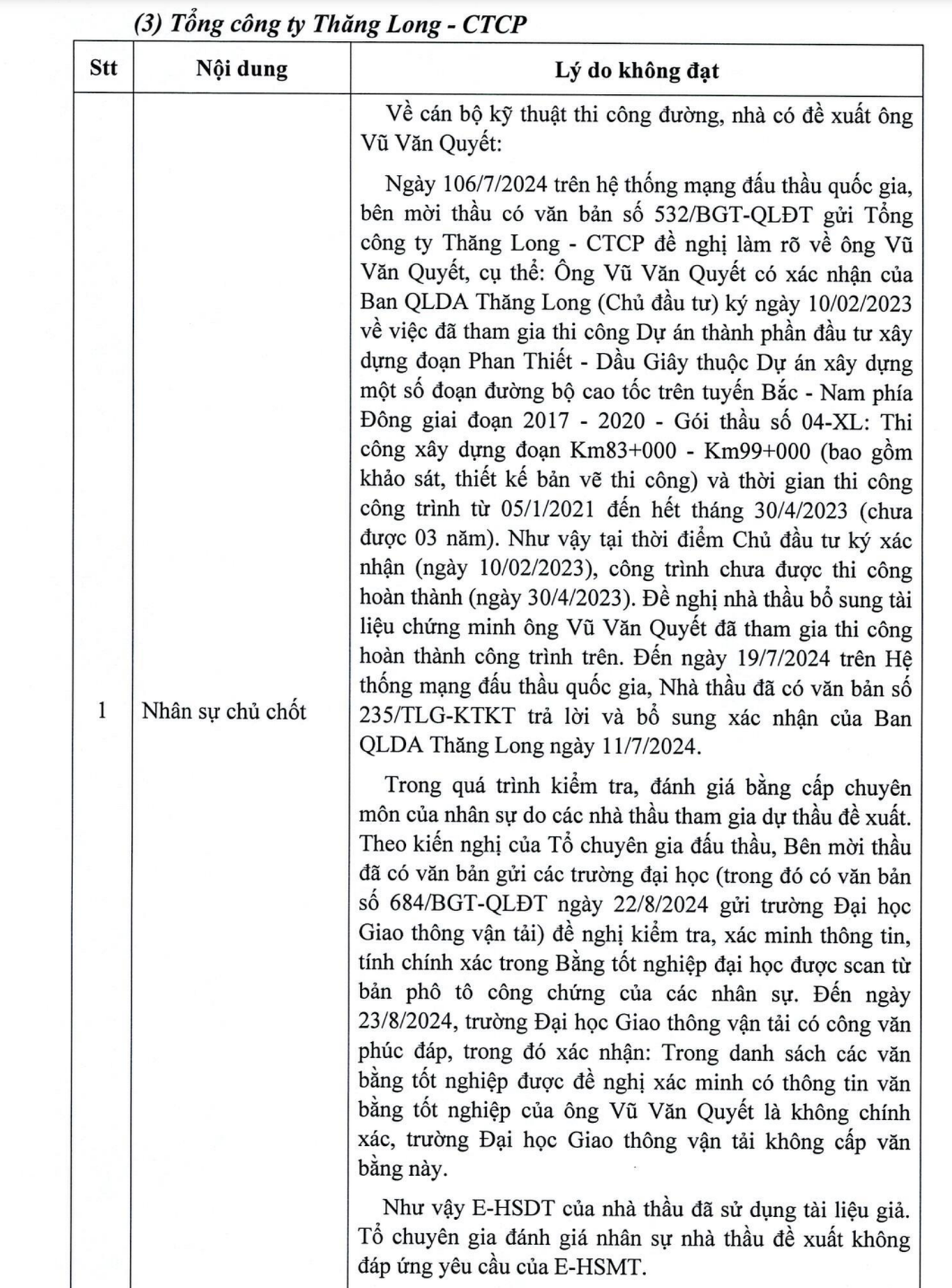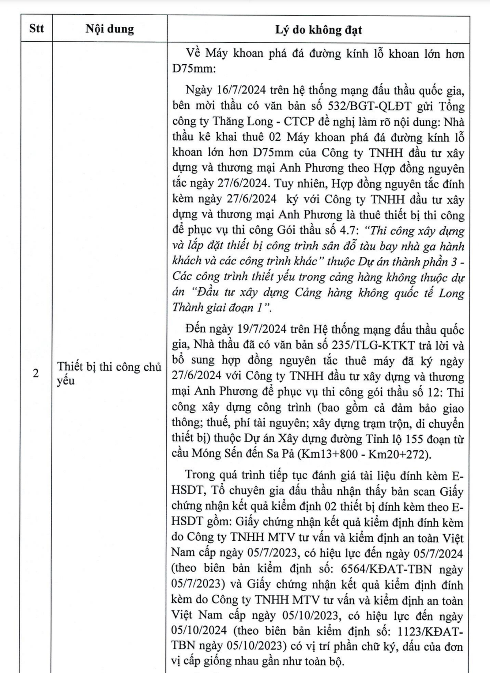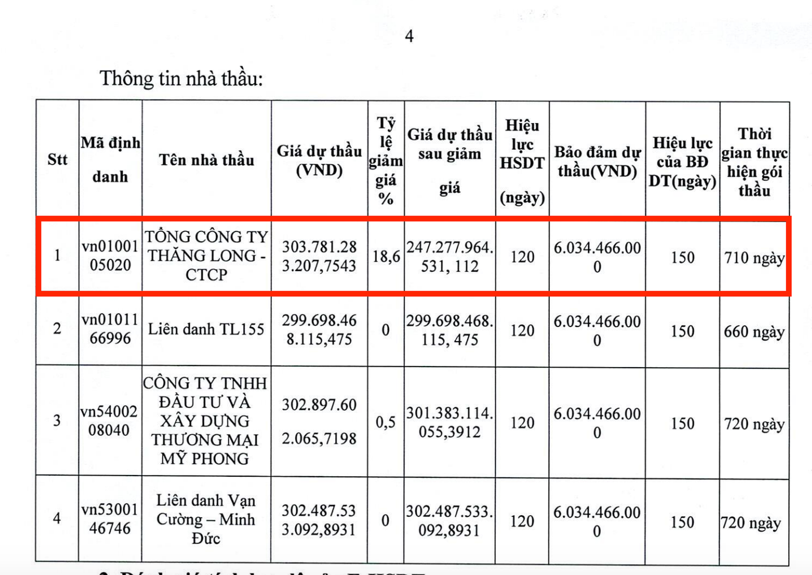Theo báo cáo đánh giá hồ sơ dự thầu (HSDT), cả 4 HSDT của 4 nhà thầu đều không đáp ứng về năng lực kinh nghiệm. Cá biệt, quá trình kiểm tra, HSDT của Tổng Công ty Thăng Long - CTCP được tổ chuyên gia đánh giá là sử dụng tài liệu giả và kiến nghị chủ đầu tư báo cáo cấp có thẩm quyền xem xét xử lý vi phạm của nhà thầu và tổ chức, cá nhân có liên quan.