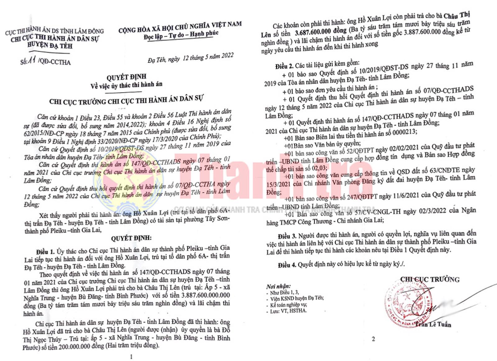 Ngày 12/5/2022, Chi cục THADS huyện Đạ Tẻh ban hành Quyết định số 11/QĐ-CCTHA về việc ủy thác thi hành án. Theo đó, Chi cục THADS huyện Đạ Tẻh ủy thác cho Chi cục THADS TP Pleiku, tỉnh Gia Lai tiếp tục thi hành án đối với ông H.X.L.