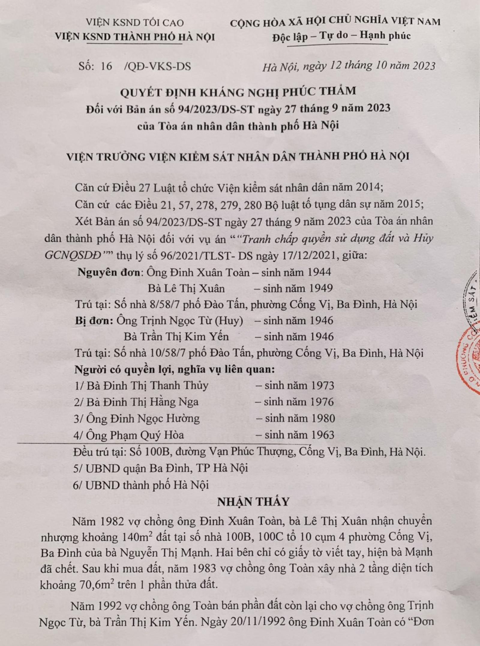 Sau khi TAND TP Hà Nội tuyên án, ngày 12/10/2023, Viện KSND TP Hà Nội đã có Quyết định số 16/QĐ-VKS-DS kháng nghị phúc thẩm đối với Bản án số 94/2023/DS-ST ngày 27/9/2023.