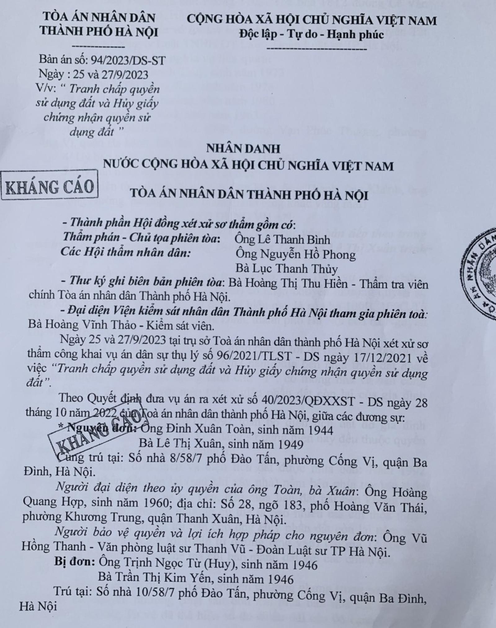 Sau 5 lần hoãn phiên tòa, trong các ngày 25 và 27/9/2023, TAND TP Hà Nội đã đưa Vụ án “tranh chấp quyền sử dụng đất và hủy giấy chứng nhận quyền sử dụng đất (GCNQSDĐ)” thụ lý số 96/2021/TLST-DS ngày 17/12/2021 giữa nguyên đơn là ông Đinh Xuân Toàn, sinh năm 1944, bà Lê Thị Xuân, sinh năm 1949, thường trú tại số nhà 8/58/7 phố Đào Tấn, phường Cống Vị, quận Ba Đình và bị đơn là ông Trịnh Ngọc Từ (Huy), sinh năm 1946, bà Trần Thị Kim Yến, sinh năm 1946, thường trú tại số nhà 10/58/7 phố Đào Tấn, phường Cống Vị, quận Ba Đình ra xét xử công khai.