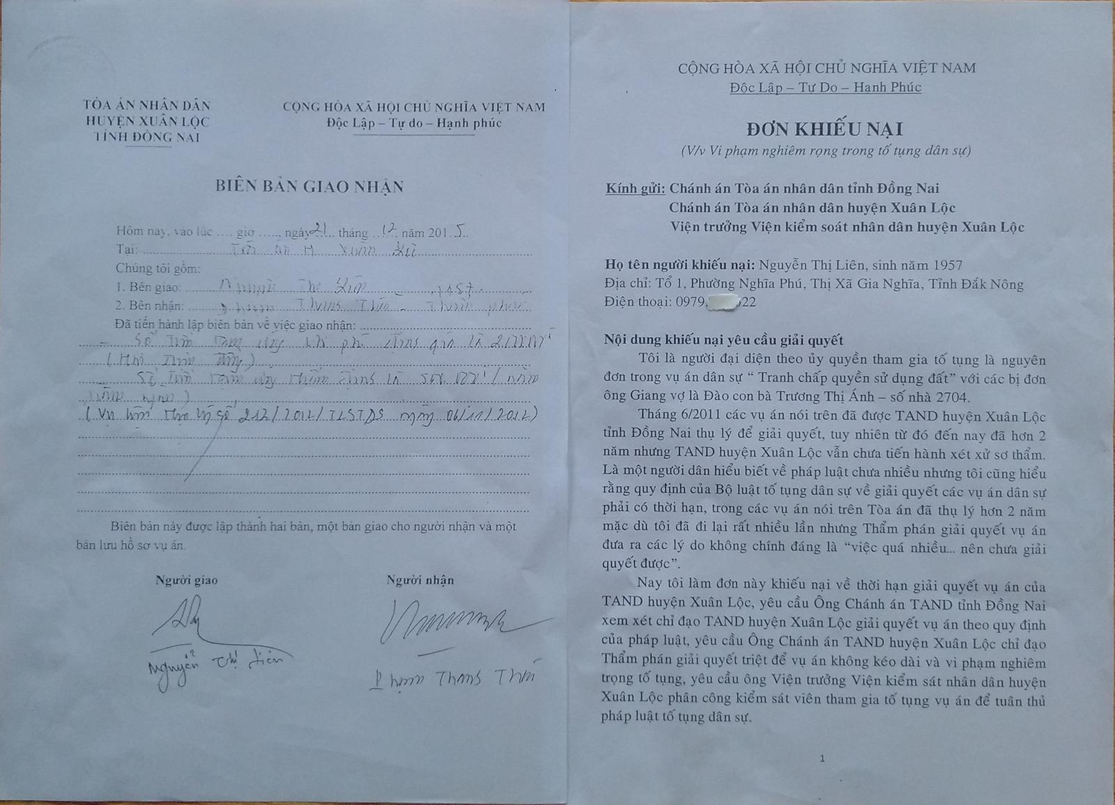 Làm đơn gửi tới Báo Thanh tra, bà Nguyễn Thị Liên cho biết: Kể từ thời điểm thụ lý vụ án (năm 2011) đến nay, TAND huyện Xuân Lộc mà trực tiếp là thẩm phán Phạm Thanh Thái đã nhiều lần gọi bà lên bổ sung hồ sơ, đóng tạm ứng chi phí thẩm định, chi phí định giá.