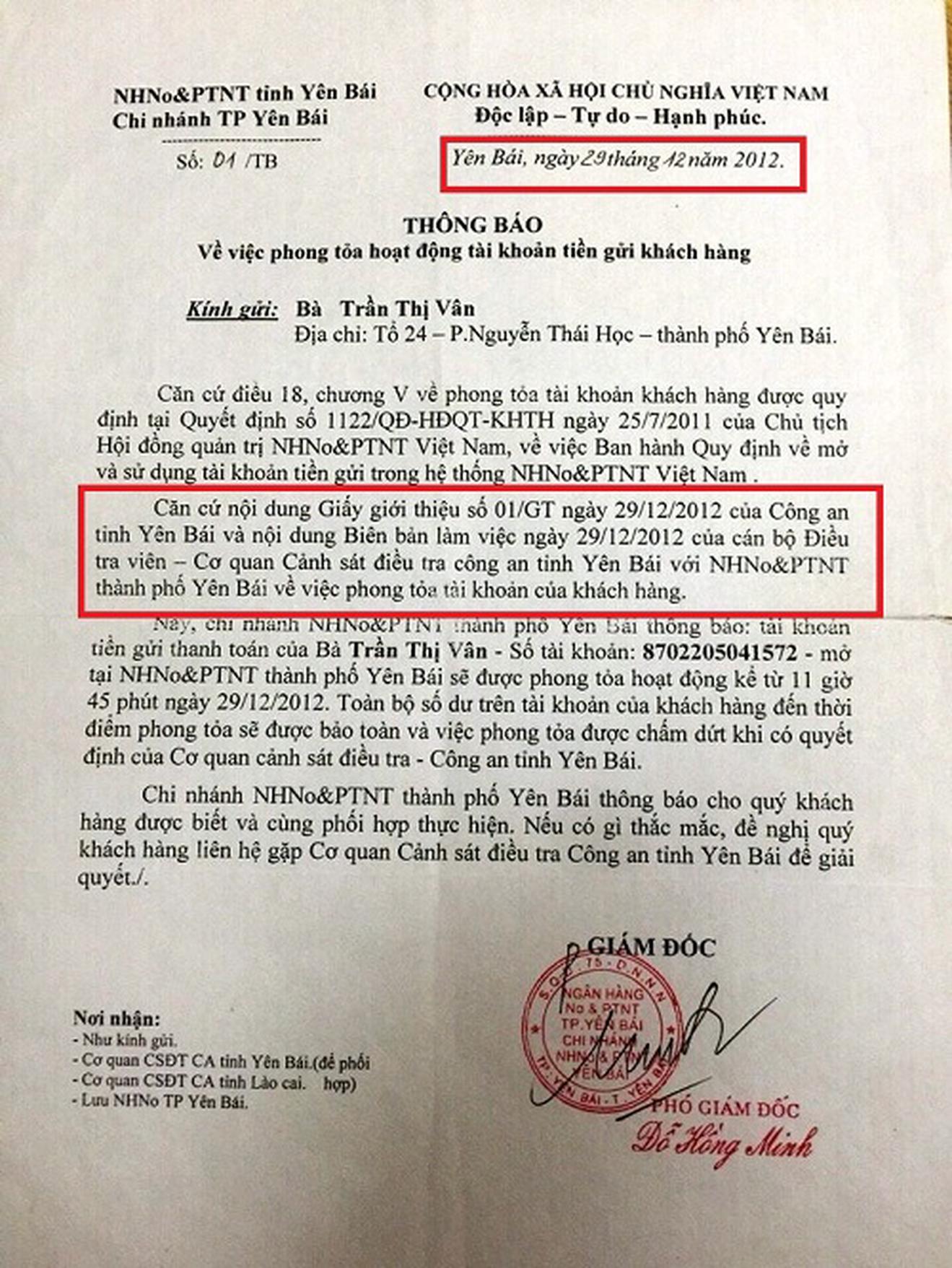 Theo thông báo từ phía Ngân hàng Nông nghiệp & Phát triển Nông thôn - Chi nhánh TP Yên Bái, trong buổi sáng ngày 29/12/2012, cơ quan này nhận được yêu cầu và đã phong tỏa tài khoản cá nhân của chị Vân từ phía Công an tỉnh Yên Bái.