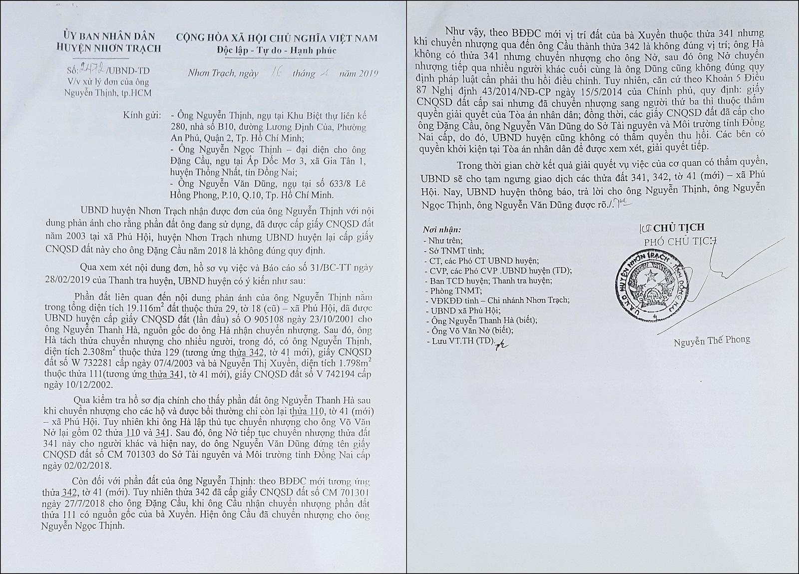 “Đối với phần đất của ông Nguyễn Thịnh, theo bản đồ địa chính mới tương ứng với thửa 342, tờ 41. Tuy nhiên, thửa 342 đã cấp GCNQSDĐ số CM701301 ngày 27/7/2018 cho ông Đặng Cầu, khi ông Cầu nhận chuyển nhượng phần đất thửa 111 có nguồn gốc của bà Xuyền. Hiện ông Cầu đã chuyển nhượng cho ông Nguyễn Ngọc Thịnh. Như vậy, theo bản đồ địa chính mới vị trí đất của bà Xuyền thuộc thửa 341 nhưng khi chuyển nhượng qua đến ông Cầu thành thửa 342 là không đúng vị trí.”, văn bản của UBND huyện Nhơn Trạch nêu rõ.