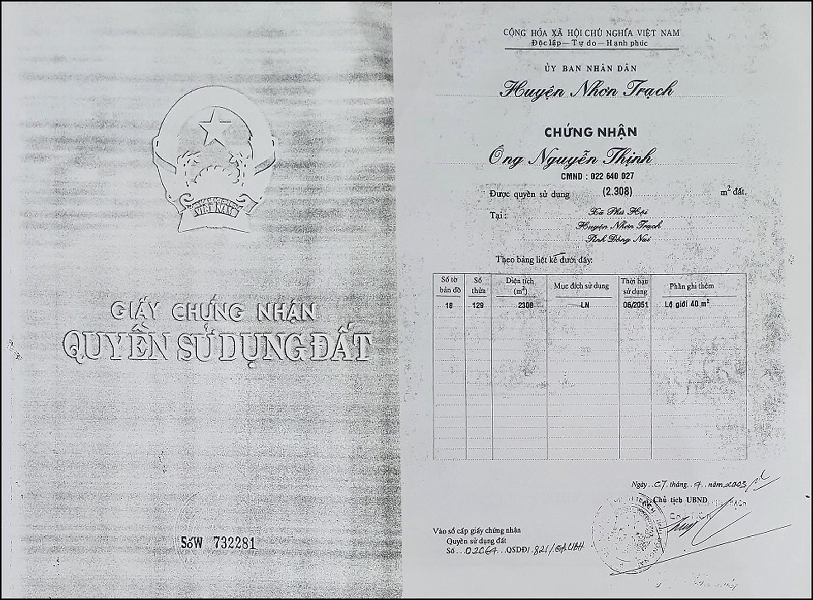Sau khi nhận chuyển nhượng, ngày 7/4/2003, UBND huyện Nhơn Trạch cấp giấy chứng nhận quyền sử dụng đất (GCNQSDĐ) cho tôi với diện tích 2.308m2 thuộc tờ bản đồ số 18, thửa 129, mục đích sử dụng là đất trồng cây lâu năm, thời hạn sử dụng đến tháng 6/2051.